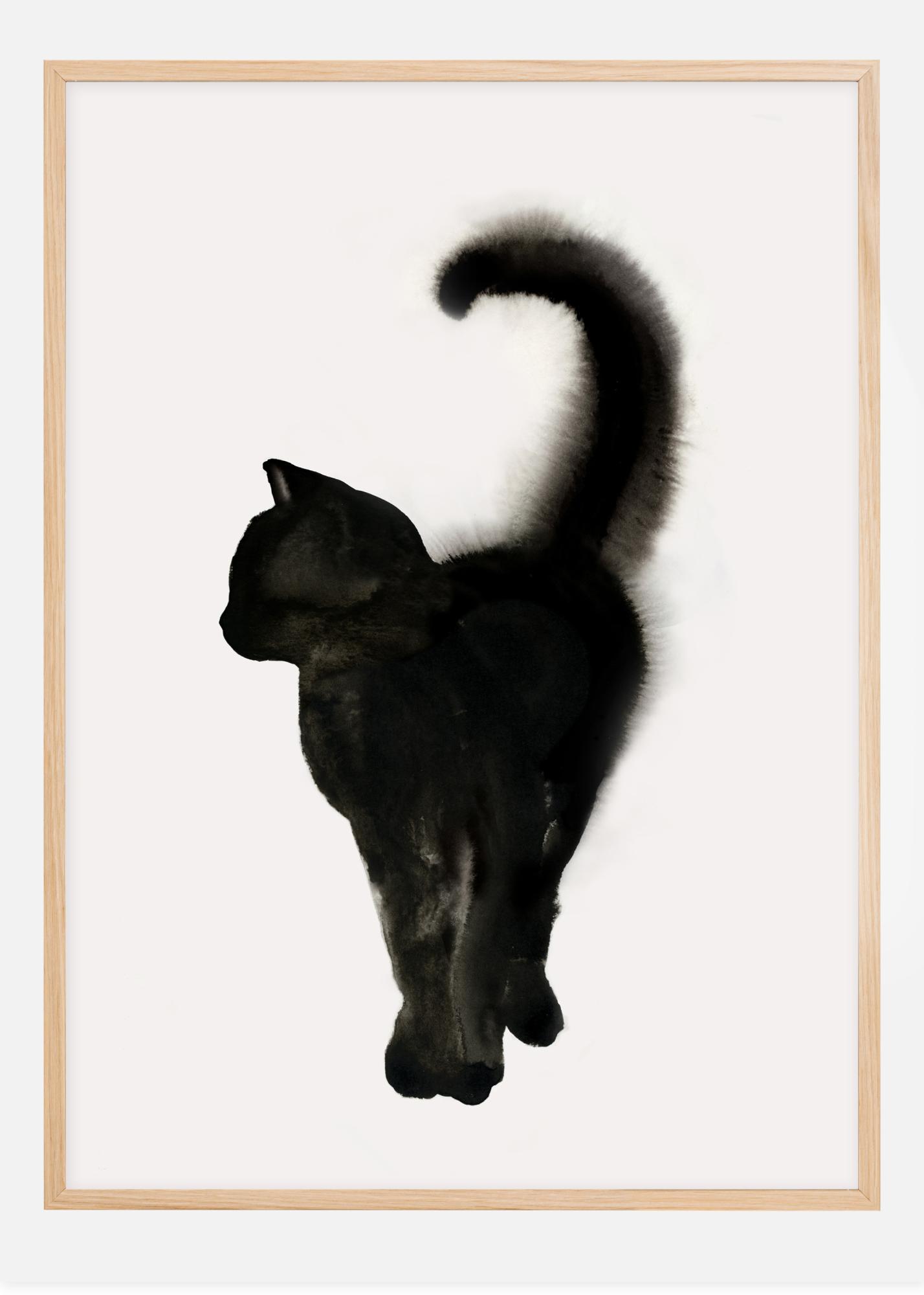 Un poster di animali con un gattino nero che posa su uno sfondo bianco. Il gatto nero sta con le zampe unite e guarda a sinistra con la coda piegata in modo interrogativo. Una combinazione di contorni duri e pennellate morbide conferisce a questa semplice immagine struttura e la rende più interessante, perfetta per qualsiasi parete.