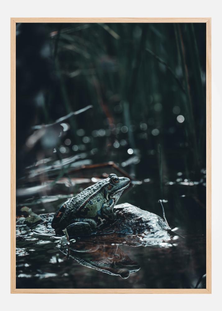 Questo incantevole poster cattura l'essenza di un momento tranquillo nella natura, dove una sola rana è raffigurata seduta su una pietra in mezzo a uno stagno scuro e misterioso. Le tonalità verdi sature della rana evidenziano la sua vivacità contro lo sfondo scuro e nebbioso e i punti di luce scintillante sulla superficie dell'acqua. Il suo riflesso sulla superficie dell'acqua calma contribuisce a un'atmosfera profonda e riflessiva.