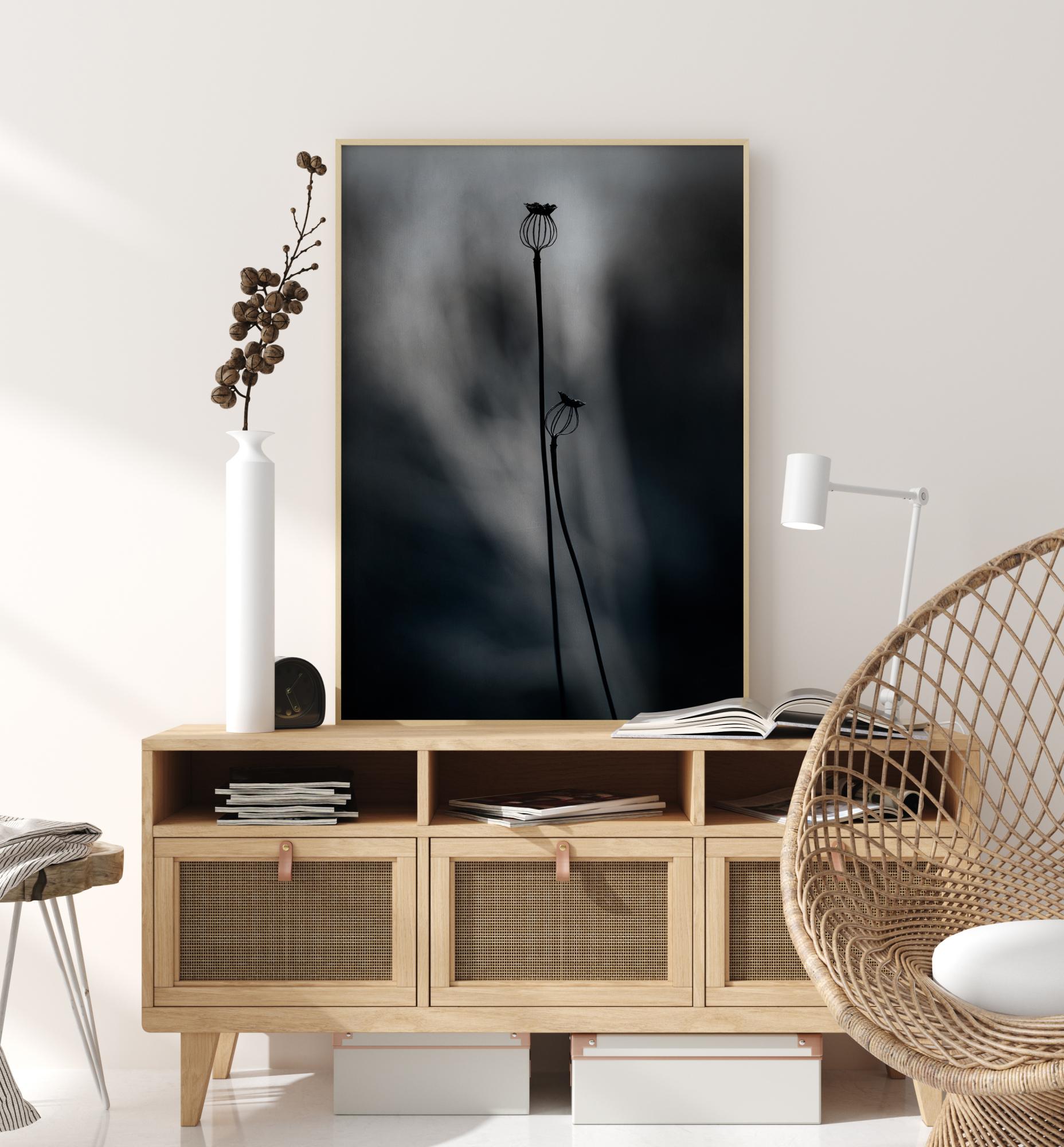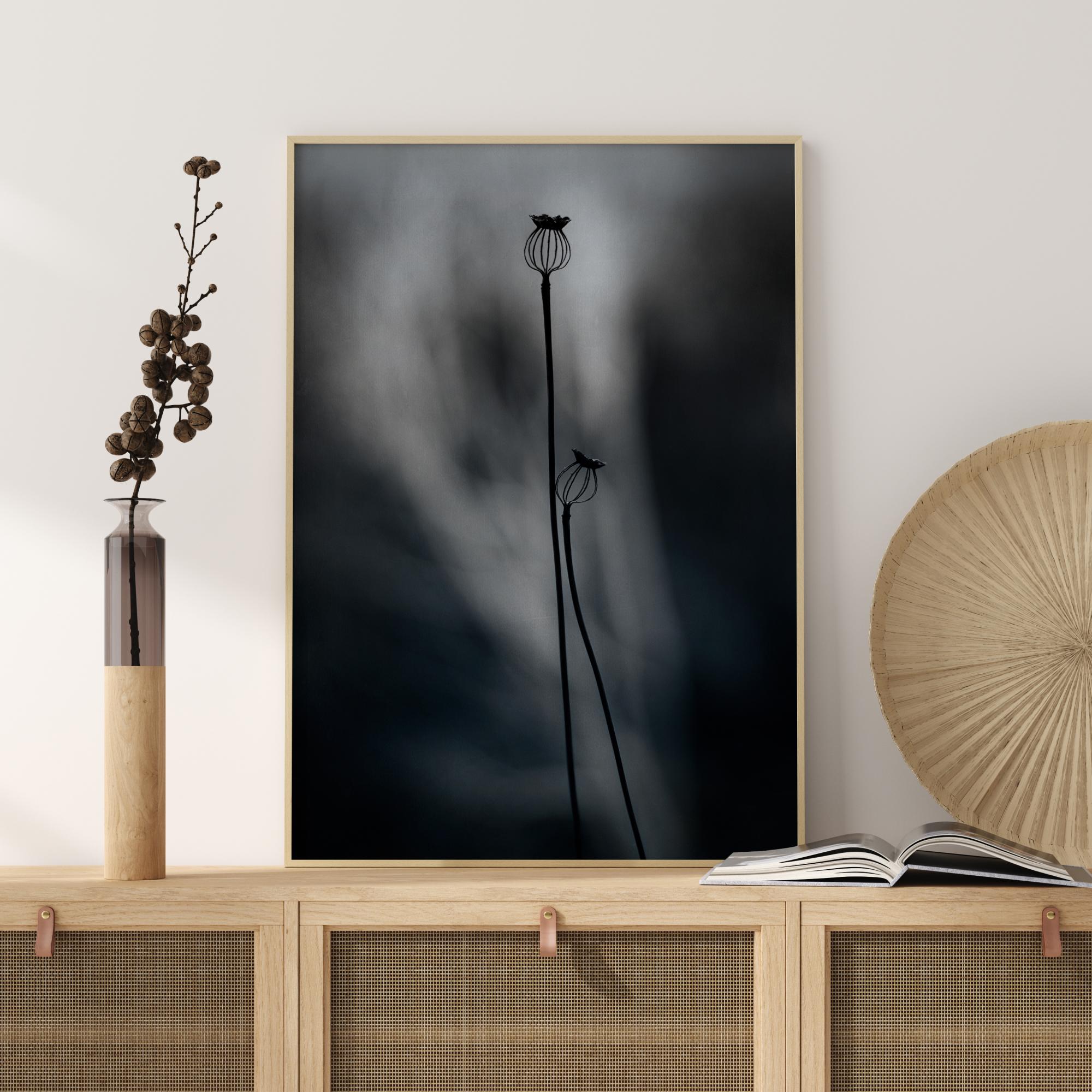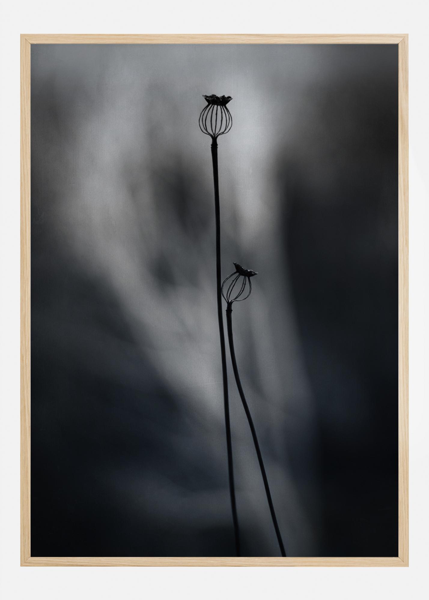 Un poster etereo di due capsule di papavero su uno sfondo leggermente sfocato. Questa immagine astratta ti catturerà per molte ore. Porta questa fantastica combinazione di tranquillità e movimento nella tua casa.