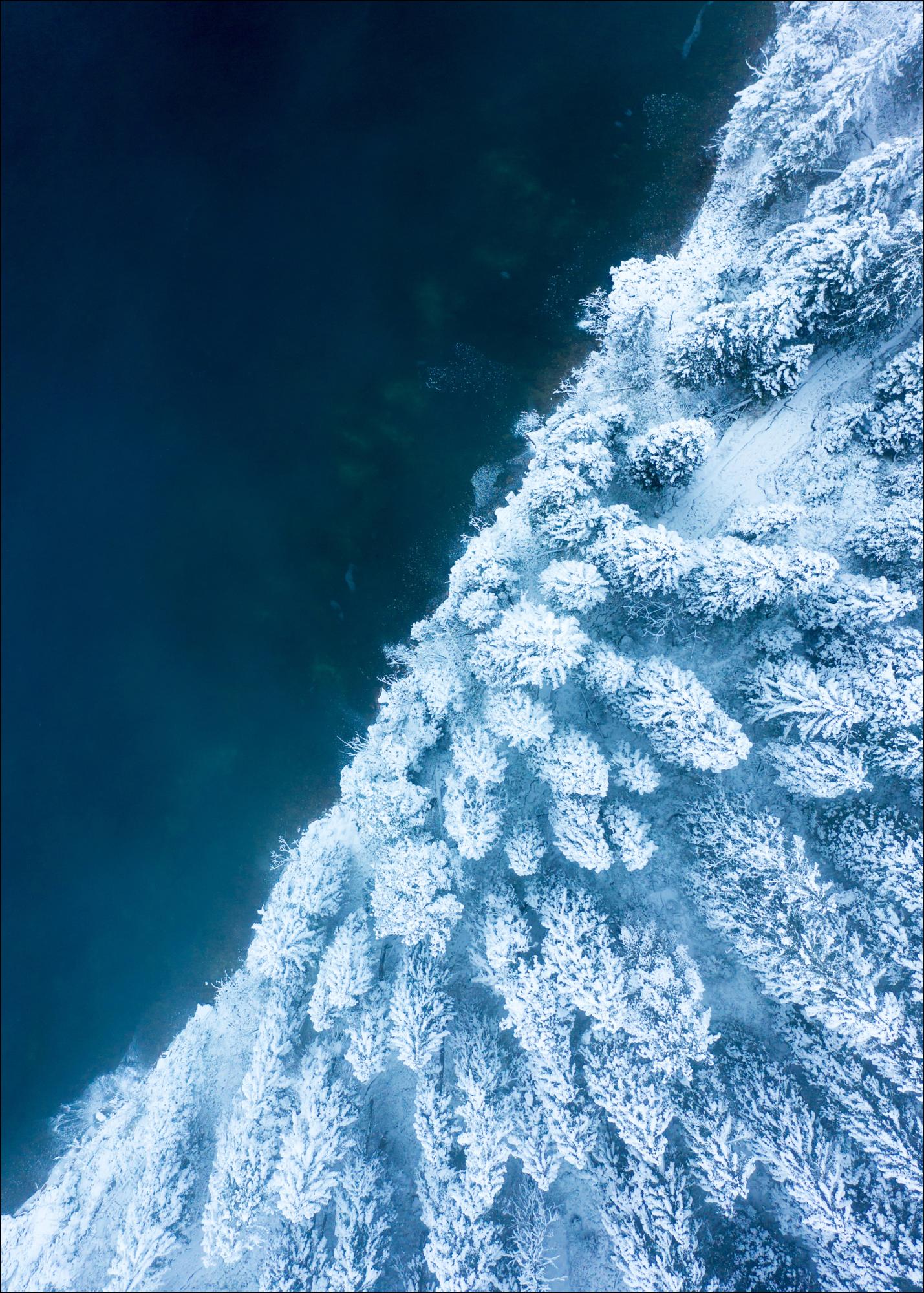 Un affascinante poster fotografico in prospettiva a volo d'uccello dove la foresta innevata incontra un mare ghiacciato in una diagonale nitida. Un bellissimo poster naturale nei toni freddi, perfetto da inserire in un collage più ampio.