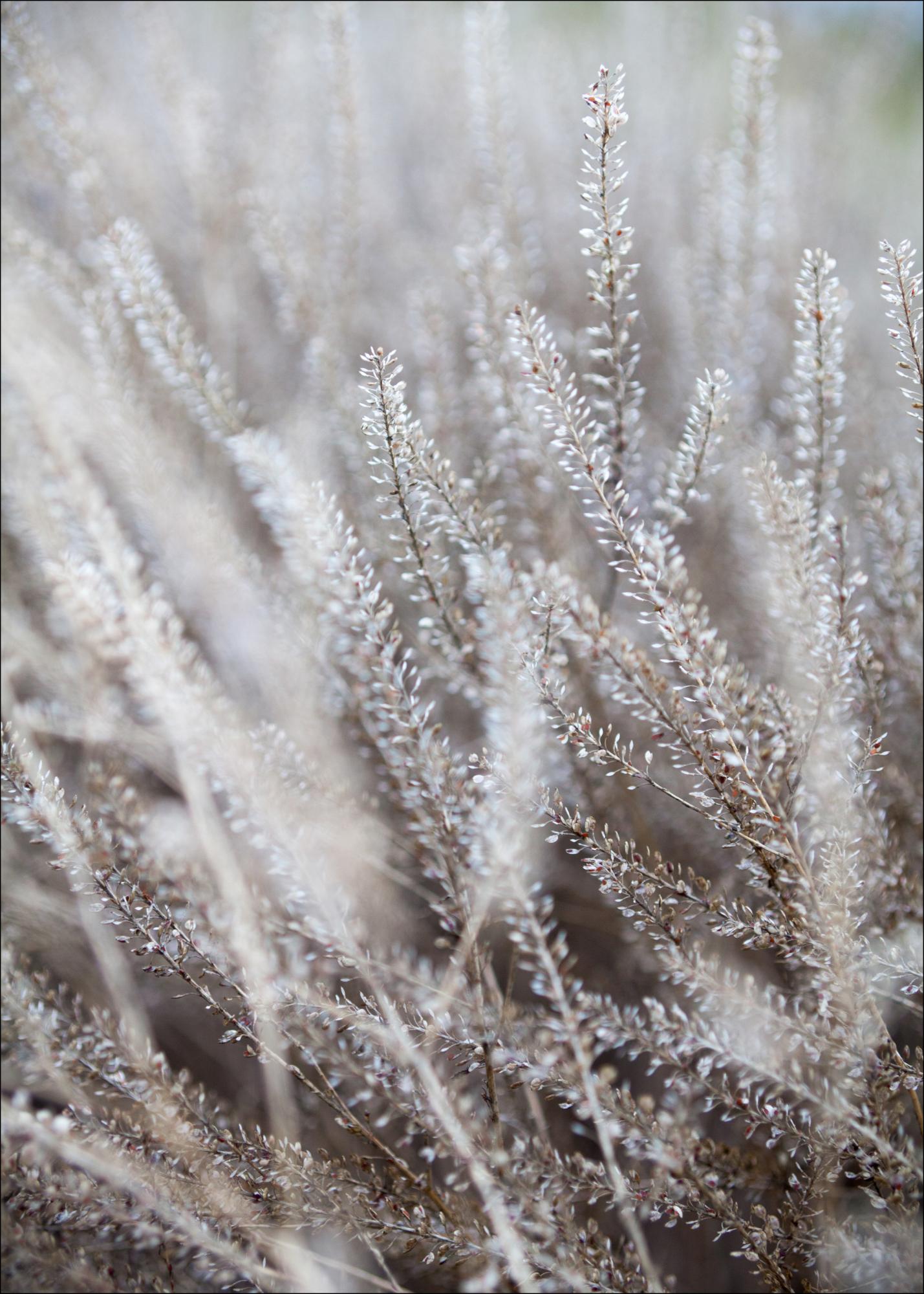 Un poster invernale con fili d'erba ghiacciati. Ogni filo d'erba fragile viene catturato in questa fantastica e piuttosto magica immagine. I fili stanno dritti ma si fondono nello sfondo dove tutto il campo d'erba ondeggia delicatamente. Appendilo a una parete calda per dare un po' di colore.