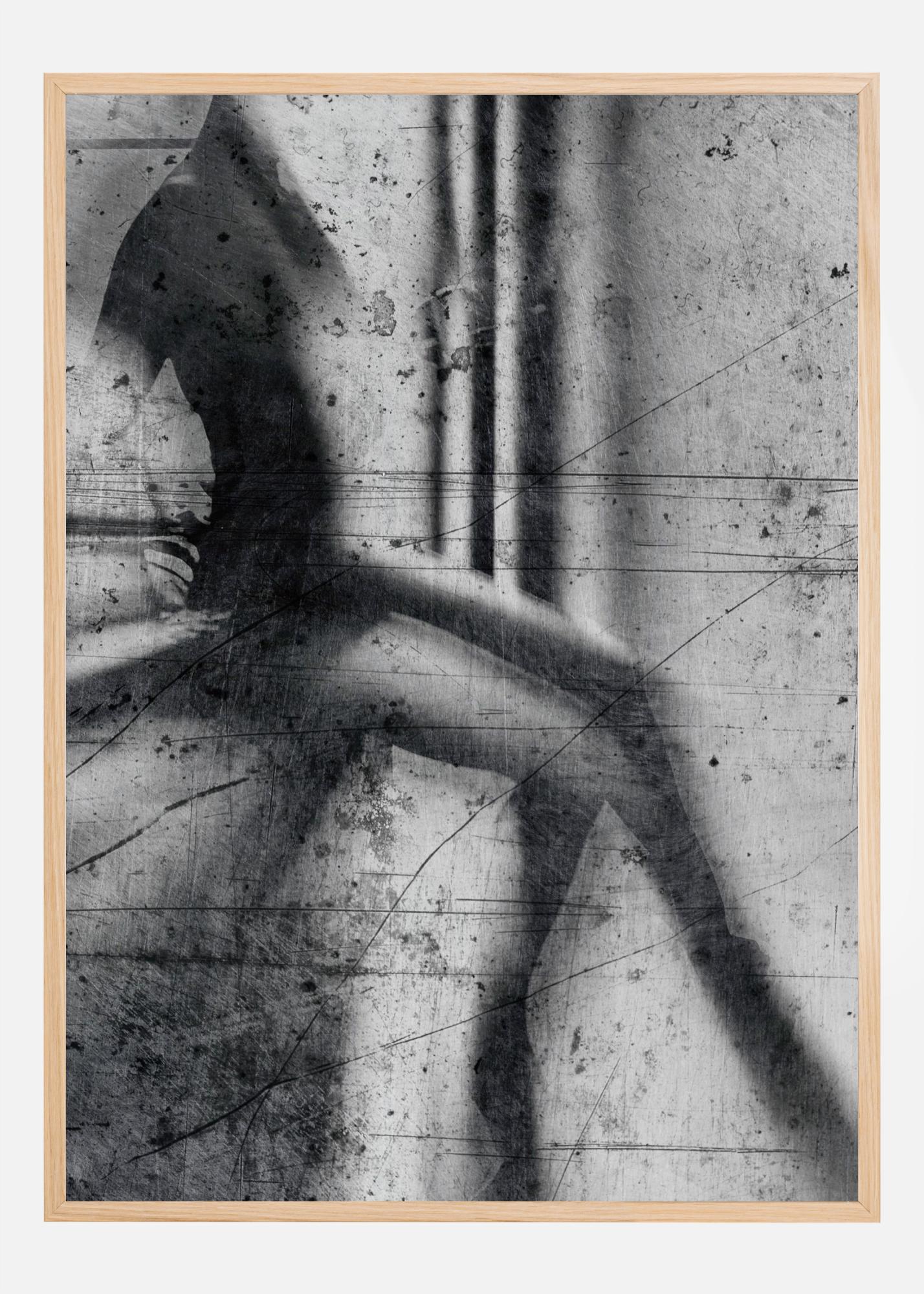 Un poster astratto con una donna seduta su un muro. L'immagine in bianco e nero è piena di linee e bordi morbidi per creare quest'opera artistica impressionista. Appendila su una parete bianca per un'impressione drammatica o abbinala a un colore audace per più dramma.