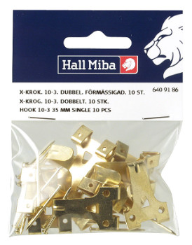 Gancio doppio a forma di X color ottone per il montaggio su pareti in legno o cartongesso. Resiste a un carico fino a 10 kg.
