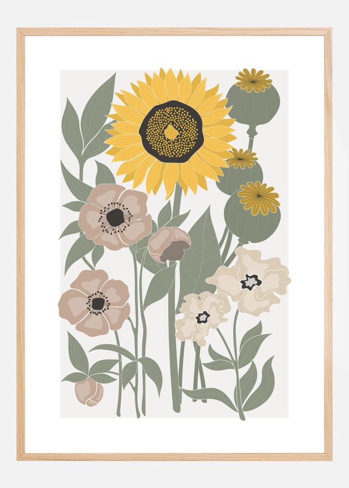 Un poster con diversi fiori. Un girasole luminoso domina il centro dell'immagine insieme ad altri fiori come il papavero in questo poster da giardino. Lo stile semplice rende facile vedere i dettagli e godersi questa immagine soleggiata.
