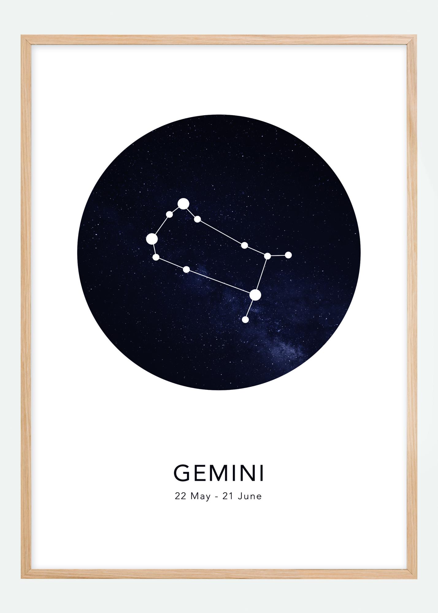 Regala un poster personalizzato a qualcuno che ami! Questo elegante poster ha un motivo del segno zodiacale dei Gemelli su uno sfondo di cielo stellato nero e blu. Sotto c'è il nome insieme alla data corrente in inglese.