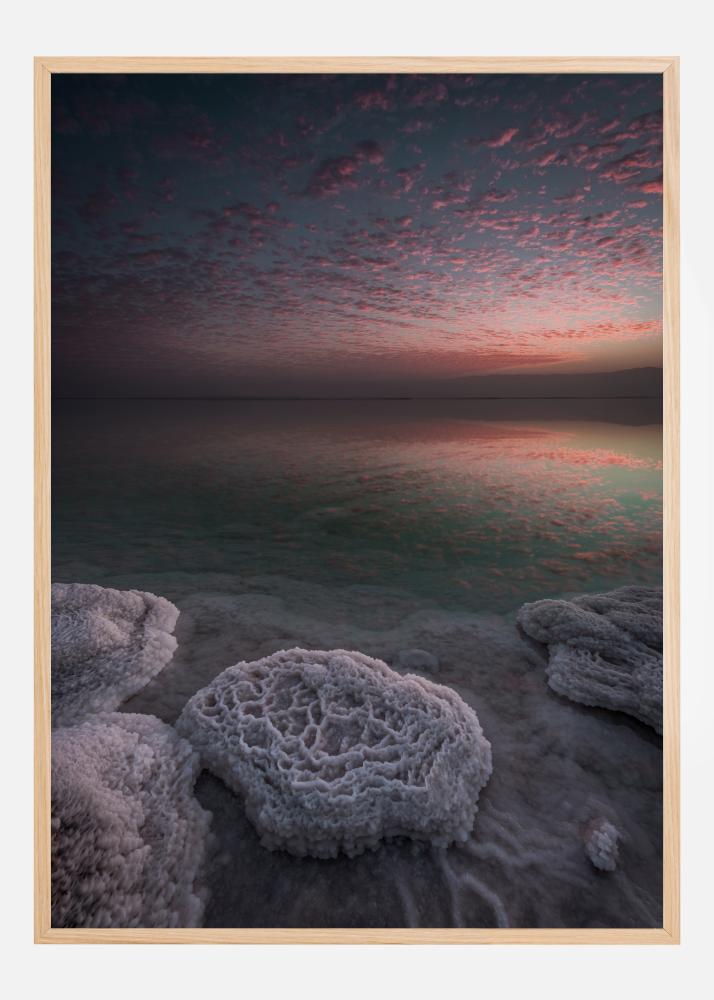 Un bellissimo poster con un lago esteso. In primo piano si sono formate grandi cristalli di sale che creano fantastici pattern naturali. Il lago si estende verso l'orizzonte mentre un cielo notturno drammaticamente rosso e blu contribuisce alla sensazione magica di questa immagine.