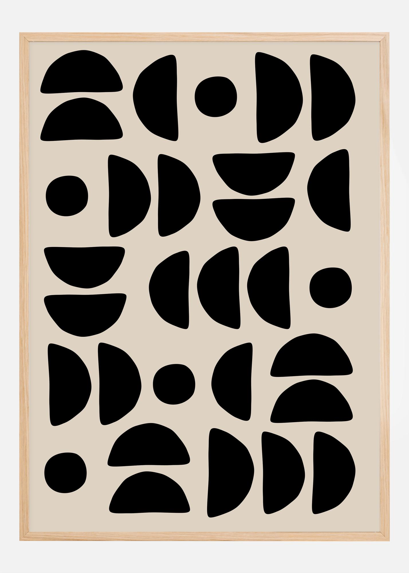 Questo poster artisticamente realizzato si distingue per il suo audace motivo di forme geometriche nere su uno sfondo beige. Il design astratto è giocoso e ritmico, creando una tensione visiva che è sia moderna che senza tempo. Quest'opera può essere vista come un omaggio sia al mondo organico che agli elementi costruiti nel design grafico, ed è perfetta per chi apprezza l'arte con linee forti e pulite e contrasti potenti.