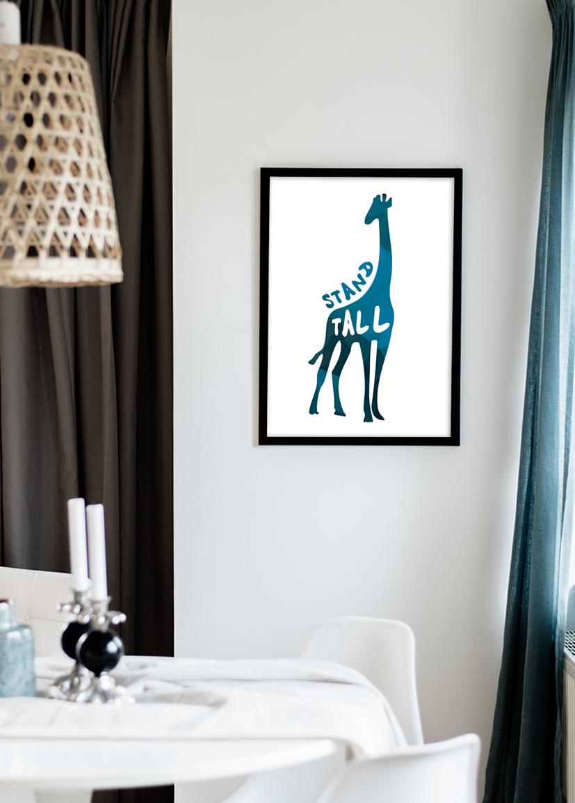 Poster blu come la lingua di una giraffa o in questo caso è l'intera giraffa ad avere il colore. La stampa stilizzata con il testo incoraggiante - Stand tall - diventa un bel regalo da fare a chi ha bisogno di un po' di incoraggiamento a difendersi ogni tanto. L'illustrazione grafica è bella da combinare con altri poster e quadri su una parete con un tema. Acquista una cornice elegante per incorniciare il poster che si adatta all'arredamento della casa per creare un senso di completezza nell'ambiente.