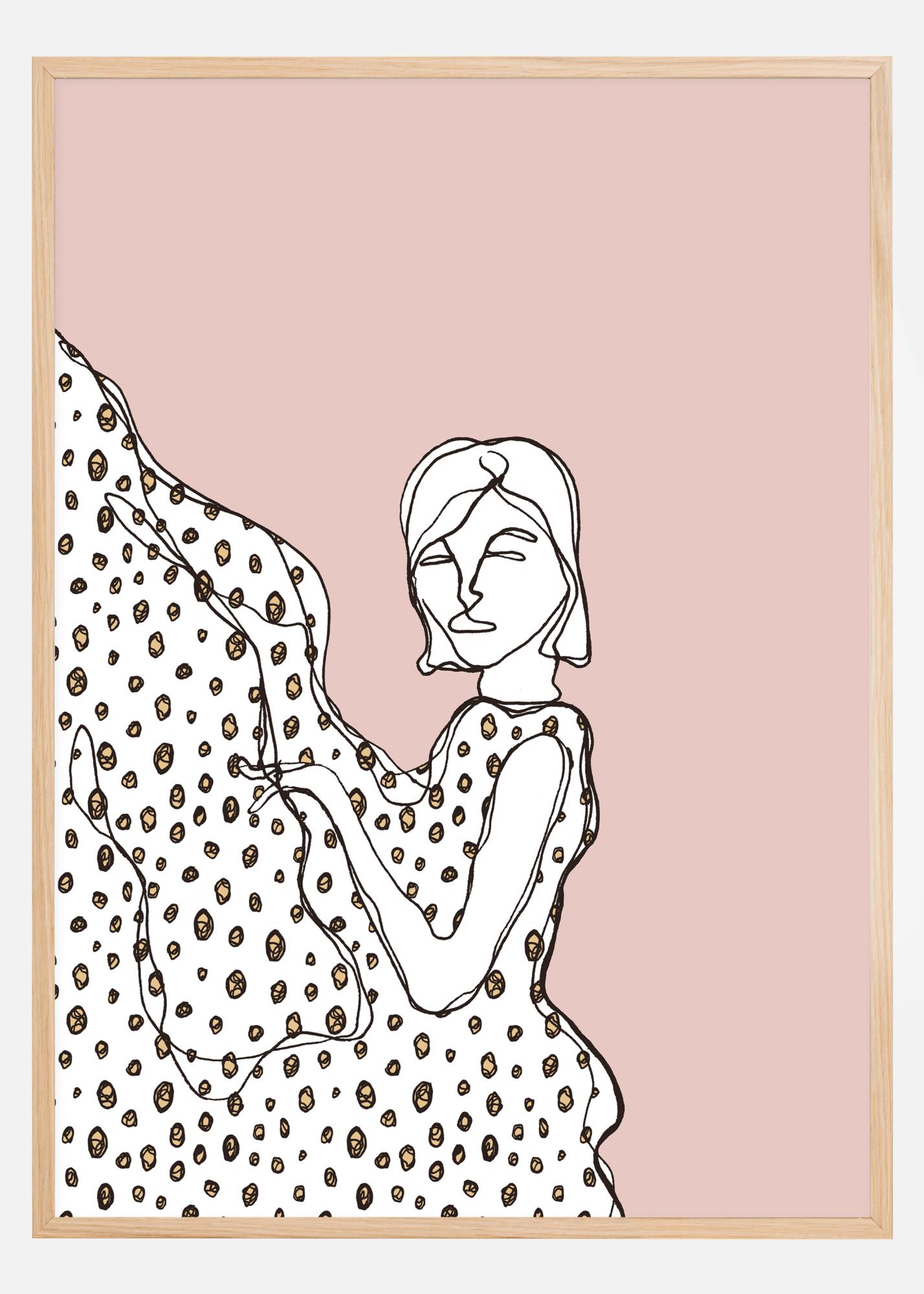 Un semplice poster con una ragazza disegnata in un vestito a pois. Lo schizzo della ragazza crea movimento mentre gira il suo vestito verso l'alto. I semplici pois spiccano sullo sfondo rosa pastello pallido dietro di lei. Cattura il suo sguardo mentre ti guarda.