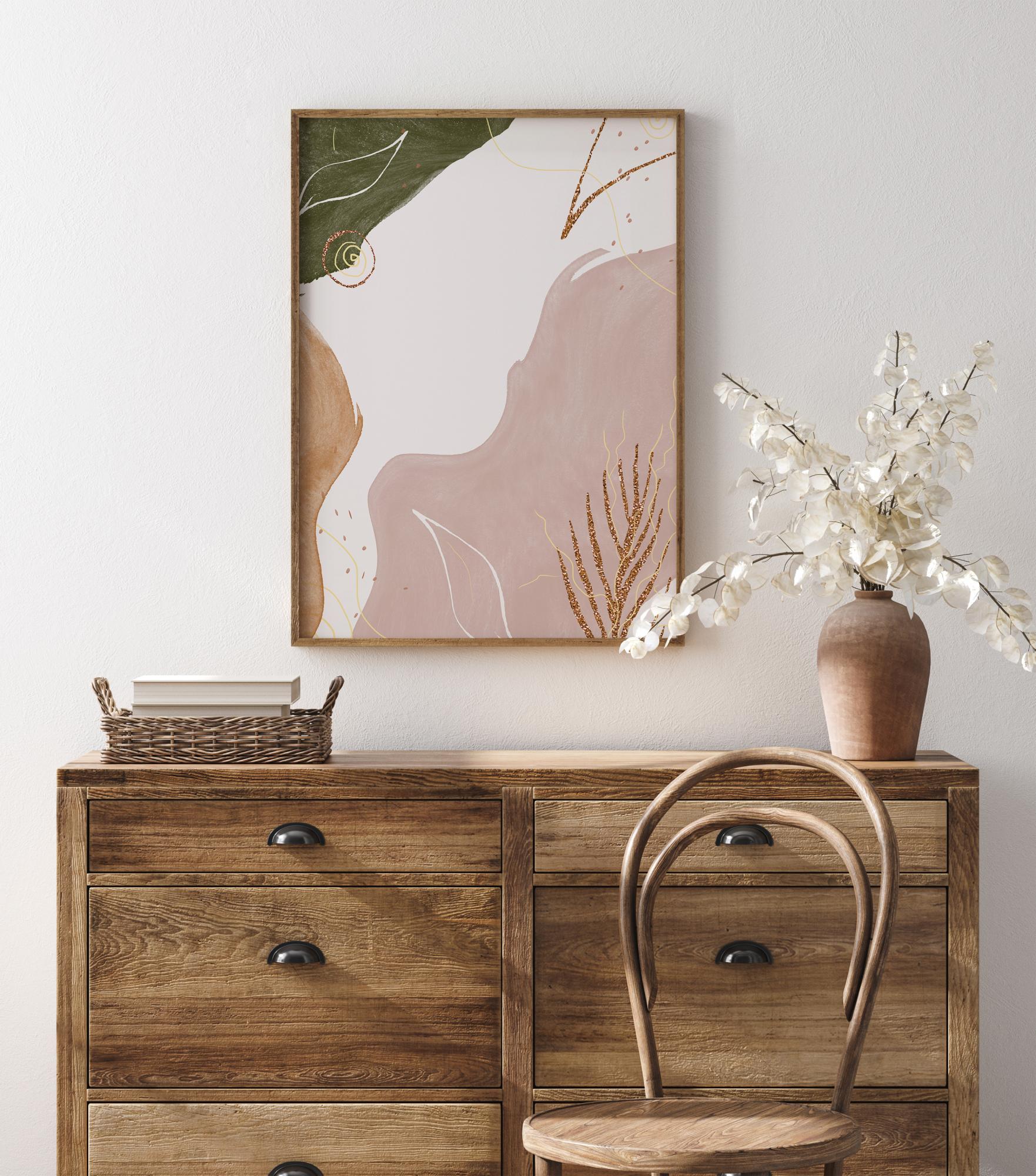 Un poster astratto pacifico con foglie e dettagli scintillanti. Grandi blocchi a forma di foglia riempiono questo poster con piccoli ramoscelli e rami creati in oro scintillante. Abbinatelo a qualsiasi colore pastello per un'aggiunta elegante al vostro muro.