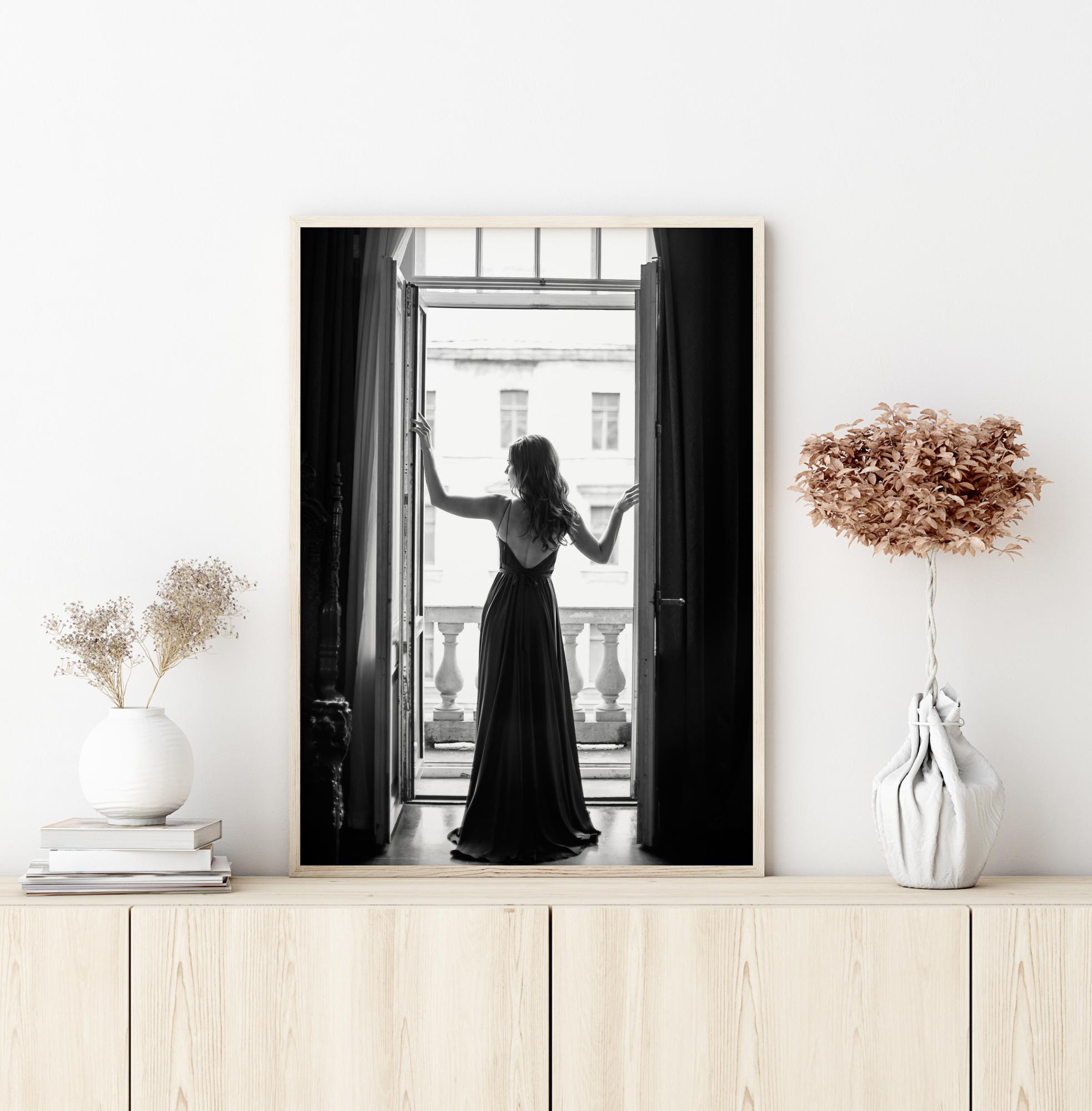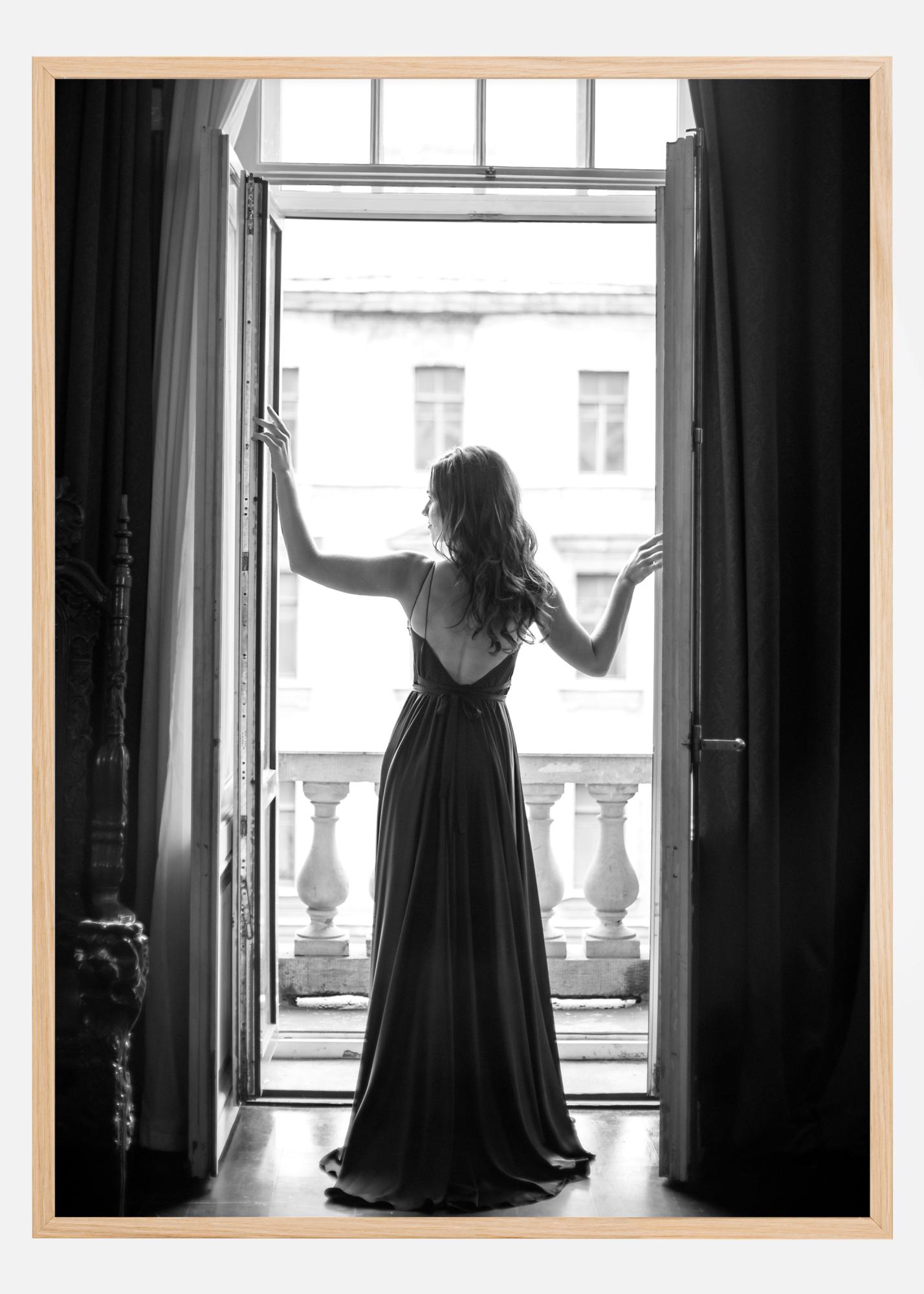Una fotografia in bianco e nero di una donna in un lungo vestito in verticale di fronte a porte-finestre aperte, guardando verso il giorno. Davanti a lei si intravedono pilastri di cemento consumati e una facciata vecchia e logora. Un poster che trasmette una meravigliosa combinazione di bellezza e vitalità in contrasto con l'antico e il logoro.
