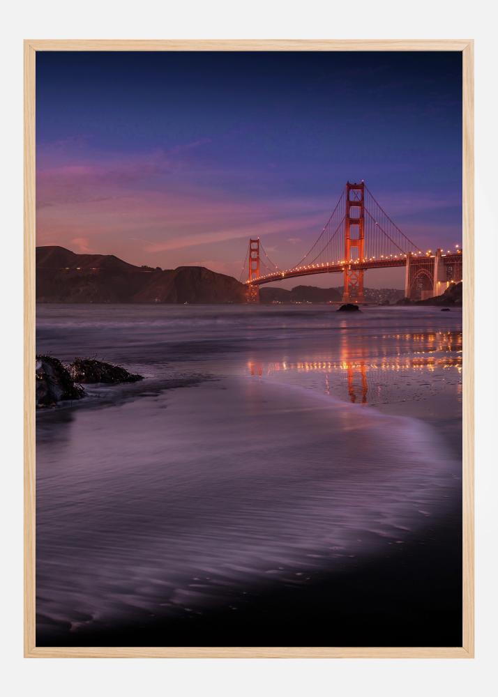 Un poster notturno del Golden Gate Bridge. Le luci dorate illuminano questo famoso ponte e si riflettono nell'acqua sottostante. Una parte della spiaggia è in primo piano, l'acqua guida lo sguardo verso il ponte e il fantastico cielo blu e dorato dove il sole tramonta. Immergiti in questa fantastica immagine notturna.