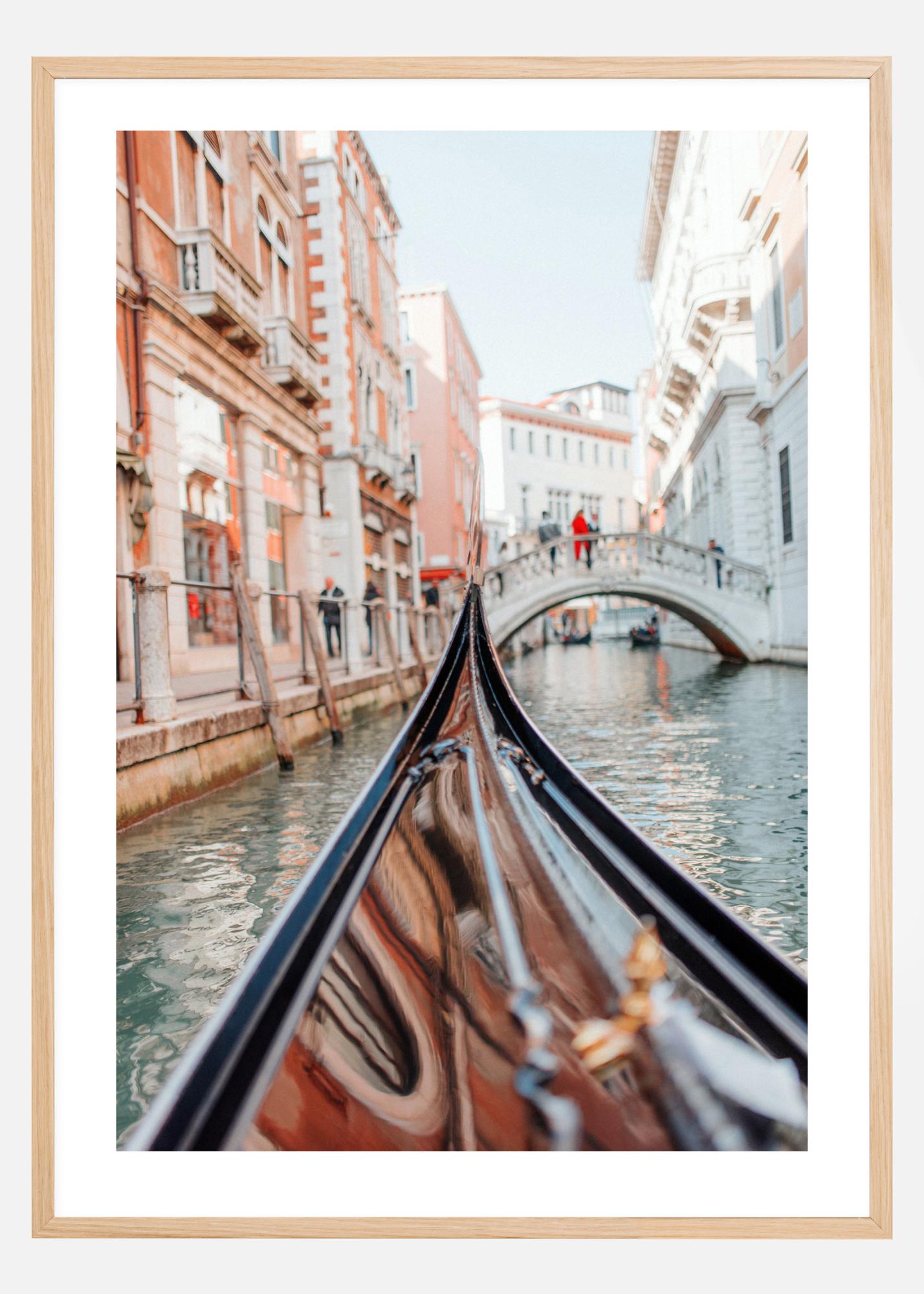 Un classico poster con una gondola che naviga attraverso i canali di Venezia. Il canale passa tra case rosa e bianche, dirigendosi verso un ponte bianco dove le persone si fermano a guardare. Immagina di essere in vacanza quando porti a casa questa immagine.