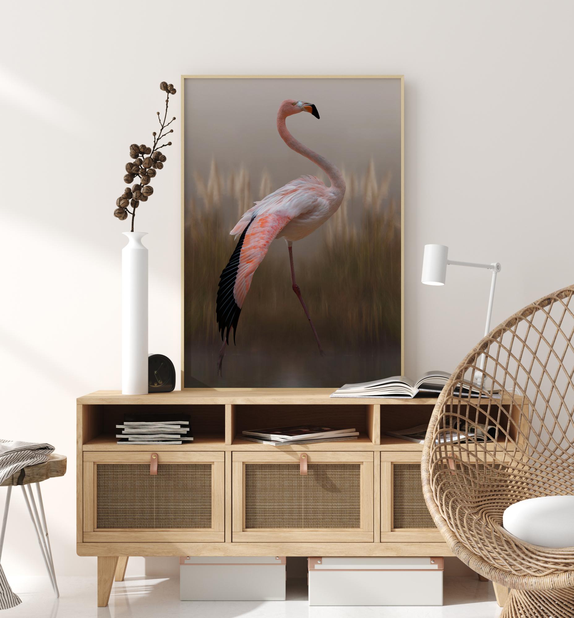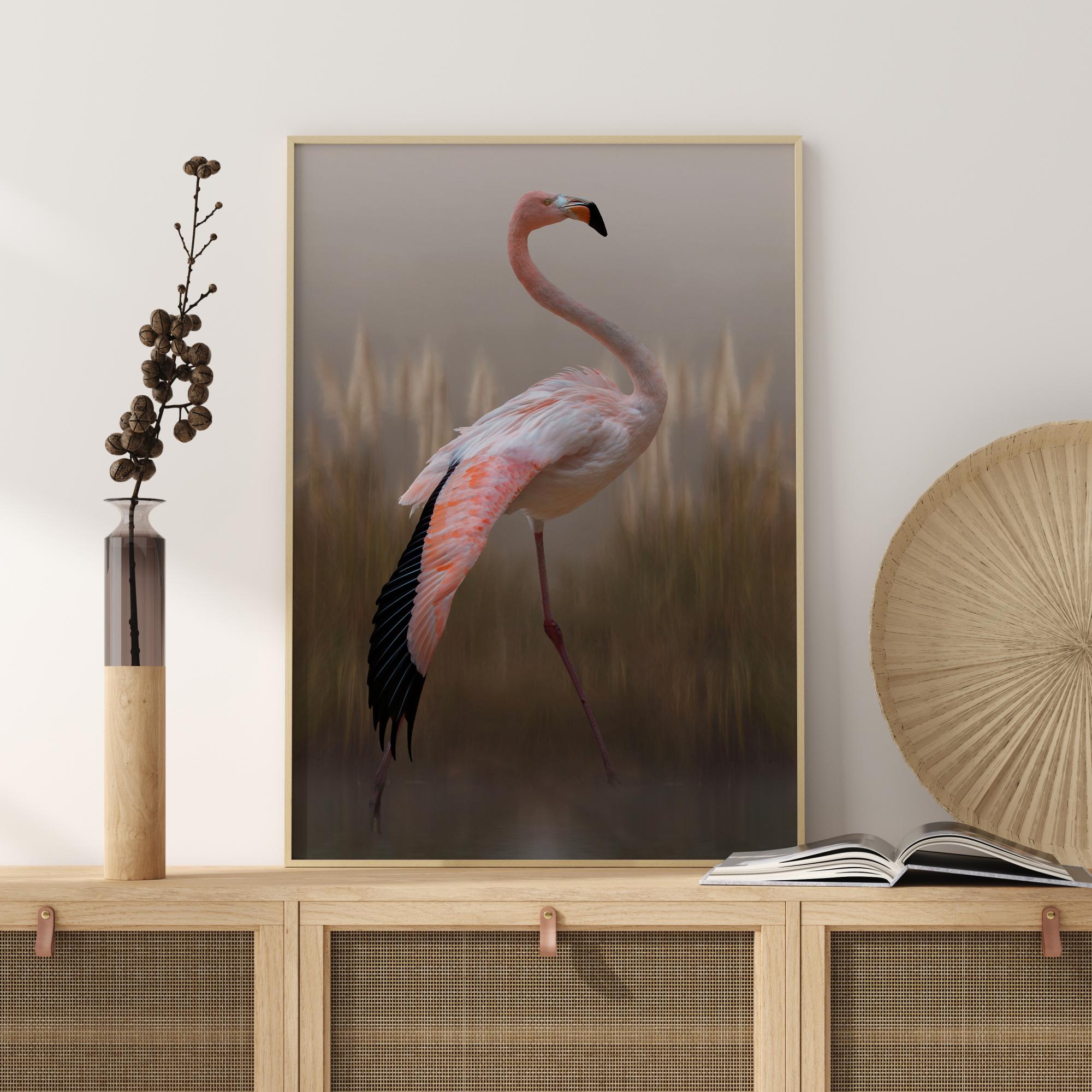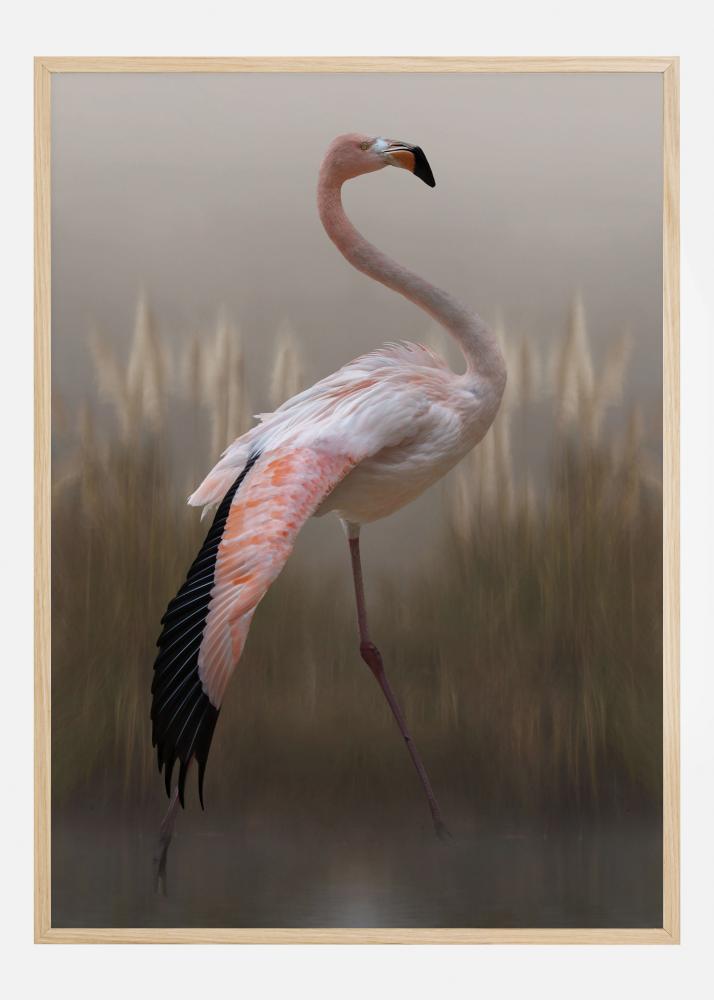 Un poster con un fenicottero rosa che si pavoneggia. Le tonalità di colore e la sfocatura della foto danno quasi la sensazione di un dipinto. Puoi immaginare di passeggiare insieme all'uccello quando combini questo poster con una semplice parete blu.