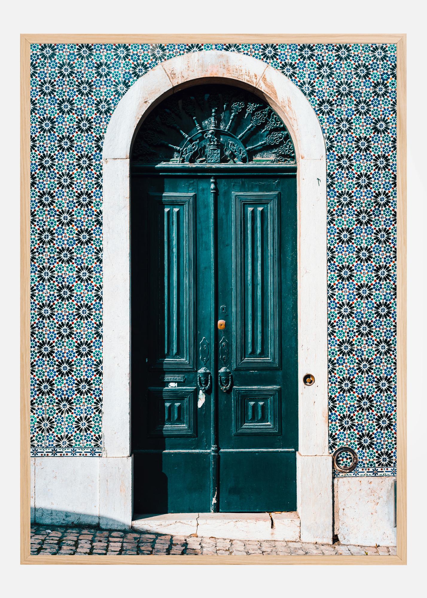 Questo elegante poster mostra una maestosa porta verde, splendidamente incorniciata da piastrelle tradizionali e dettagliate in blu e bianco. Il design classico e il colore audace della porta contrastano con i motivi intricati, creando un senso di accoglienza e ricchezza culturale. L'immagine trasmette la sensazione di un ingresso invitante a una casa piena di storia e carattere.
