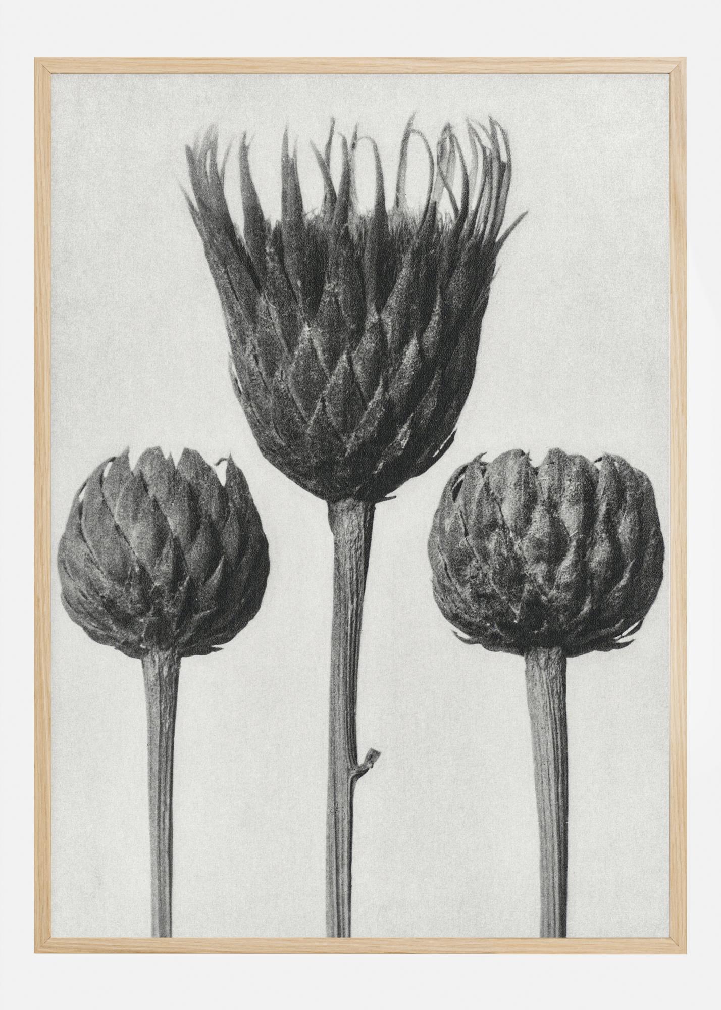 Un poster naturale con tre fiori grigi su un unico stelo. I tre fiori grigi si ergono alti su uno sfondo bianco e sono quasi posizionati uno accanto all'altro. Il fiore grigio in primo piano si è aperto più dei fiori più piccoli. Questa è la stampa perfetta da appendere nel tuo giardino d'inverno.