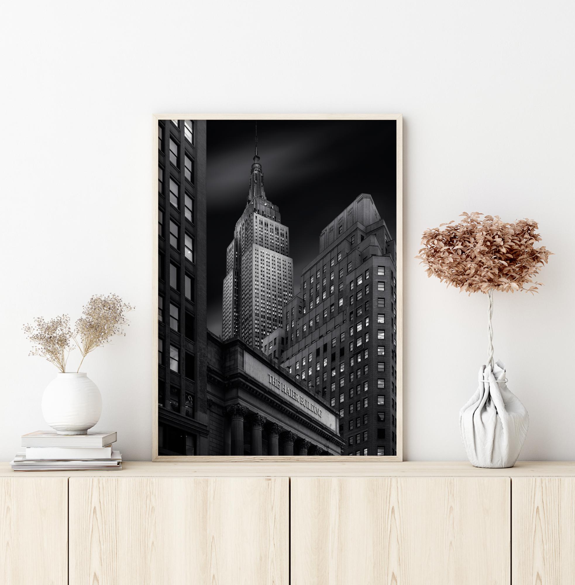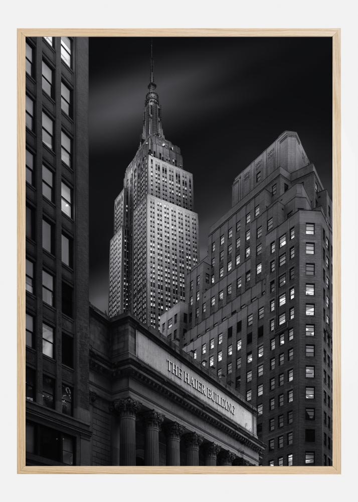Un poster con l'edificio Haier a New York di notte. Le luminose lettere dorate dell'edificio illuminano e dicono "The Haier Building". Con gli edifici di fronte a una vista della città nera, questa è un'immagine molto prominente. Questo poster in bianco e nero drammatico del centro di New York è perfetto su una parete bianca.