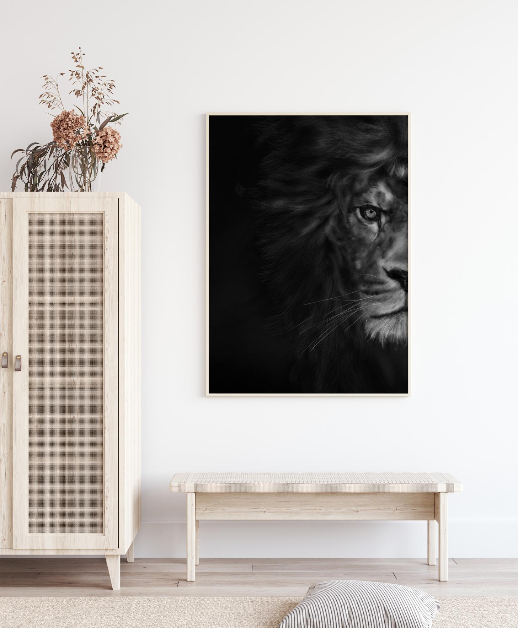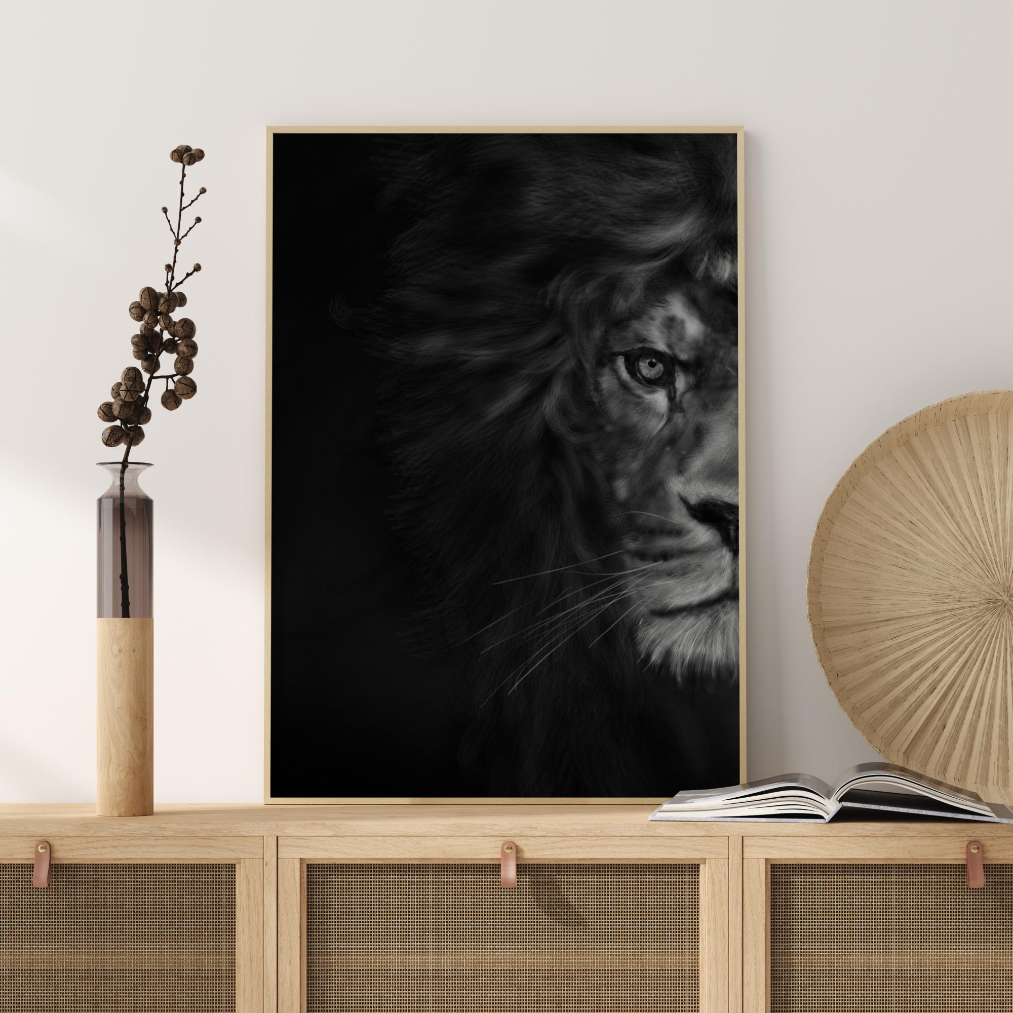 Un incredibile poster in bianco e nero della natura con un leone selvaggio che guarda dritto verso la telecamera. Posizionato a destra della stampa, si vede solo metà del viso del leone. Con la sua bellissima criniera ondulata e la sua posa maestosa, può essere definito il re della giungla. Porta la sensazione di safari nella tua casa.
