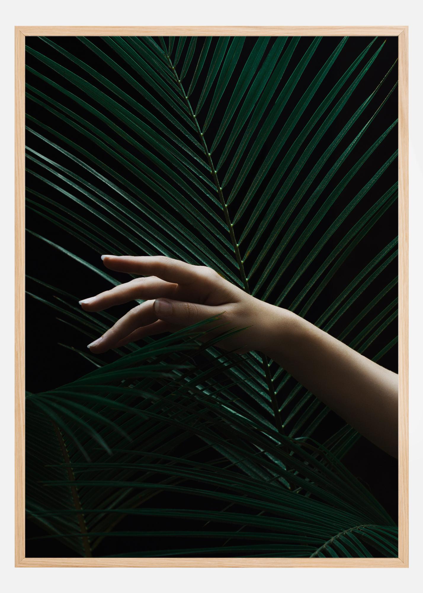 Una fotografia botanica di rami verdi simili a palme davanti a uno sfondo nero. Una mano tesa contribuisce con un elemento vivace e contrastante. Un poster cupo che si adatta perfettamente a una parete più grande.