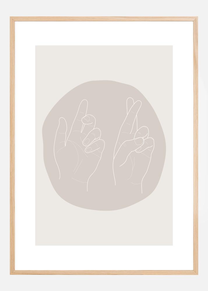 Un semplice poster di due mani sinistre contro una forma rotonda beige. Il cerchio è posizionato su uno sfondo color carne con entrambe le mani che puntano verso il bordo superiore del poster. Le mani sono rilassate e creano un'atmosfera tranquilla nella tua casa. Un'immagine perfetta per il tuo studio.