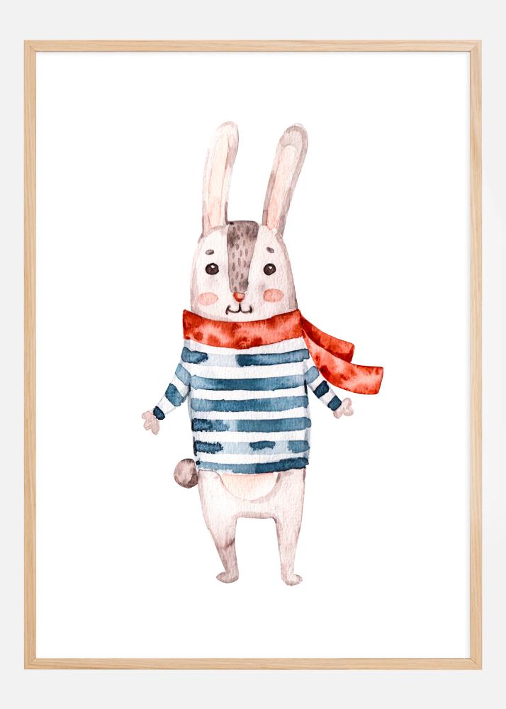 Questa incantevole locandina ritrae un coniglio allegro vestito con un maglione a righe e una sciarpa rossa svolazzante. Il caldo sorriso del coniglio e il suo atteggiamento giocoso emanano gioia e innocenza, creando un sentimento affettuoso e invitante. L'illustrazione, realizzata in morbidi toni acquerellati, ha una leggerezza e una semplicità che conferiscono un effetto toccante e nostalgico.