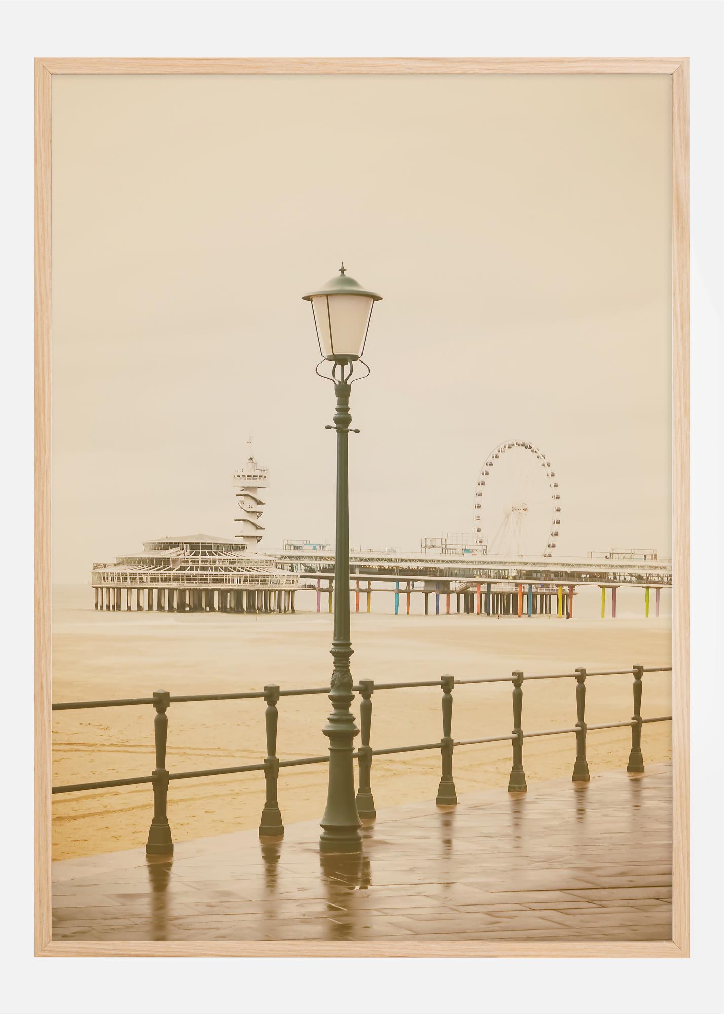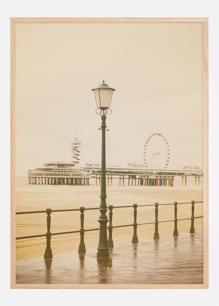 Questo poster nostalgico evoca la sensazione di una giornata lenta e sognante al mare. Una lanterna vecchio stile si erge in primo piano, una guardiana silenziosa sulla passeggiata deserta con il suo classico parapetto. Sullo sfondo si vede un molo con una torre di osservazione e una grande ruota panoramica, che aggiunge una sensazione di romantico parco divertimenti senza tempo. I delicati toni seppia e beige rafforzano la sensazione di un'era passata e invitano alla riflessione.