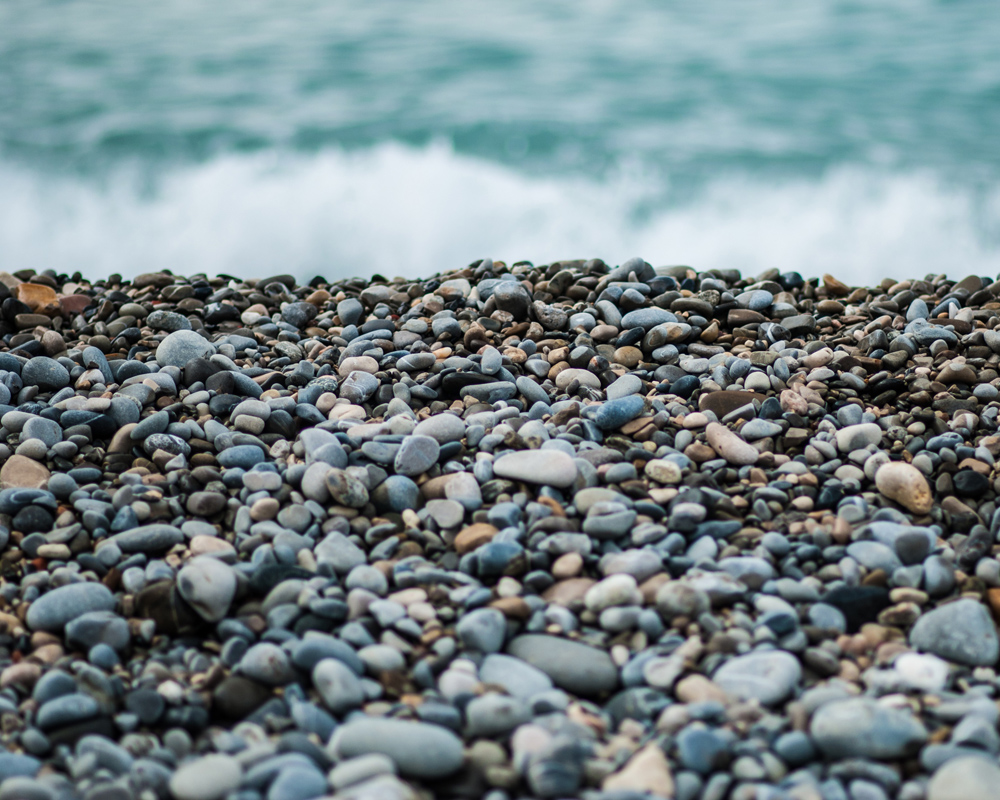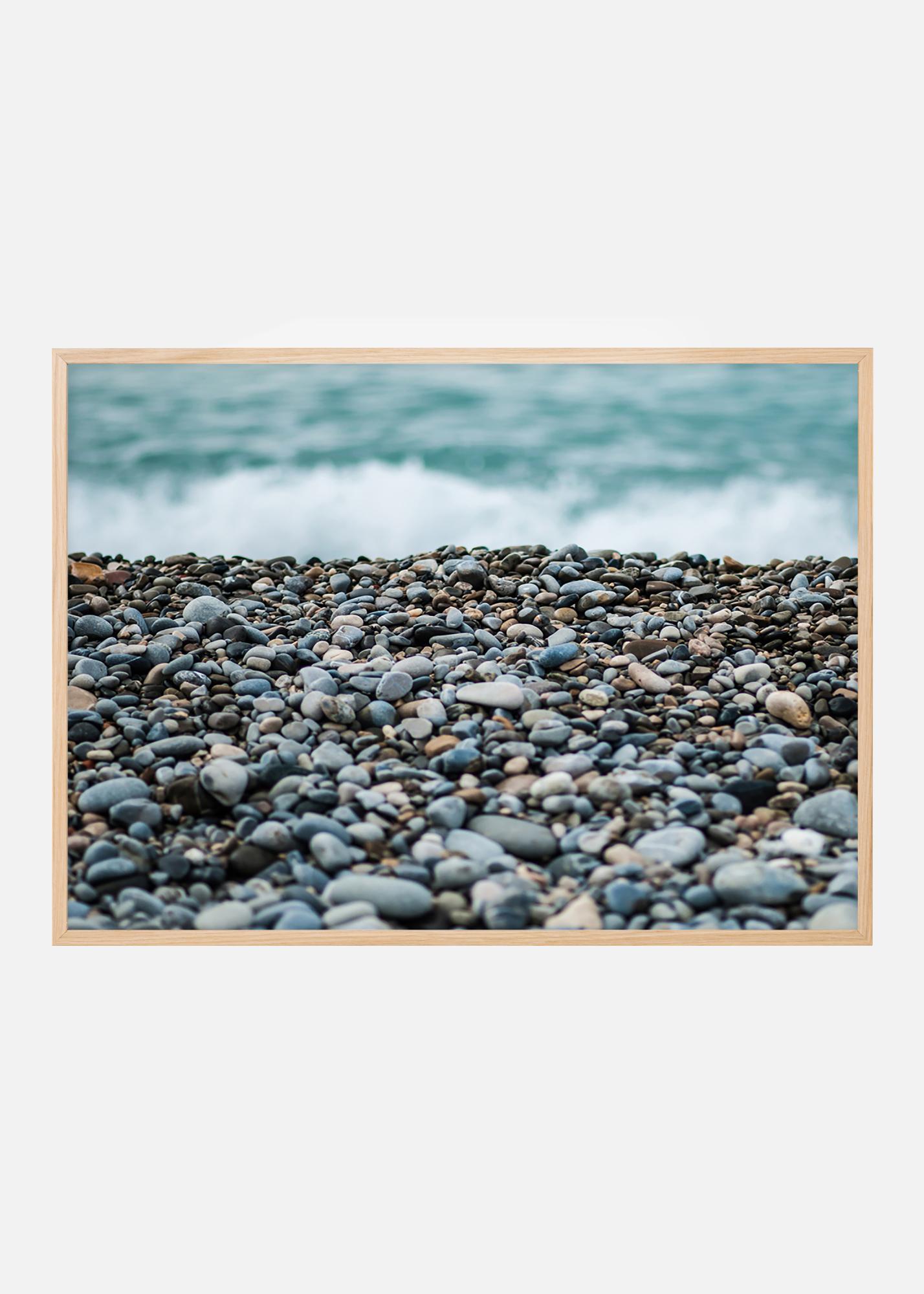 Ascolta il rumore delle onde del mare da questo poster con una bellissima spiaggia di ciottoli in primo piano. La breve profondità di campo crea un'immagine interessante che cattura lo sguardo. Riesci a trovare un pezzo di vetro levigato tra le rocce? La scala di grigi e blu si abbina bene con una cornice sottile su una parete chiara, possibilmente con accessori marini.