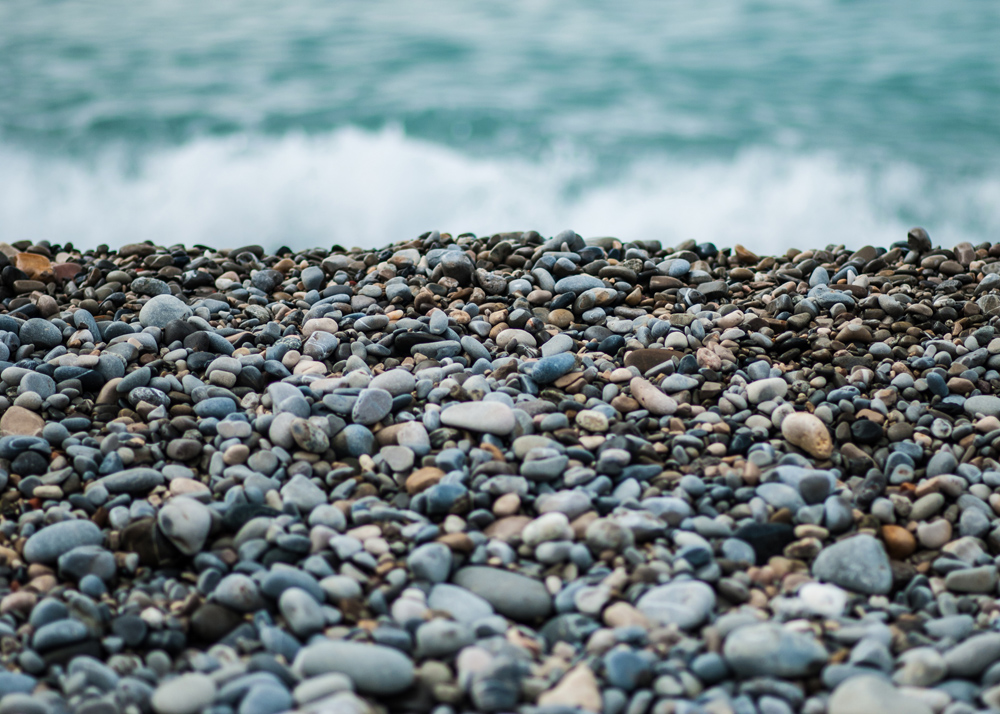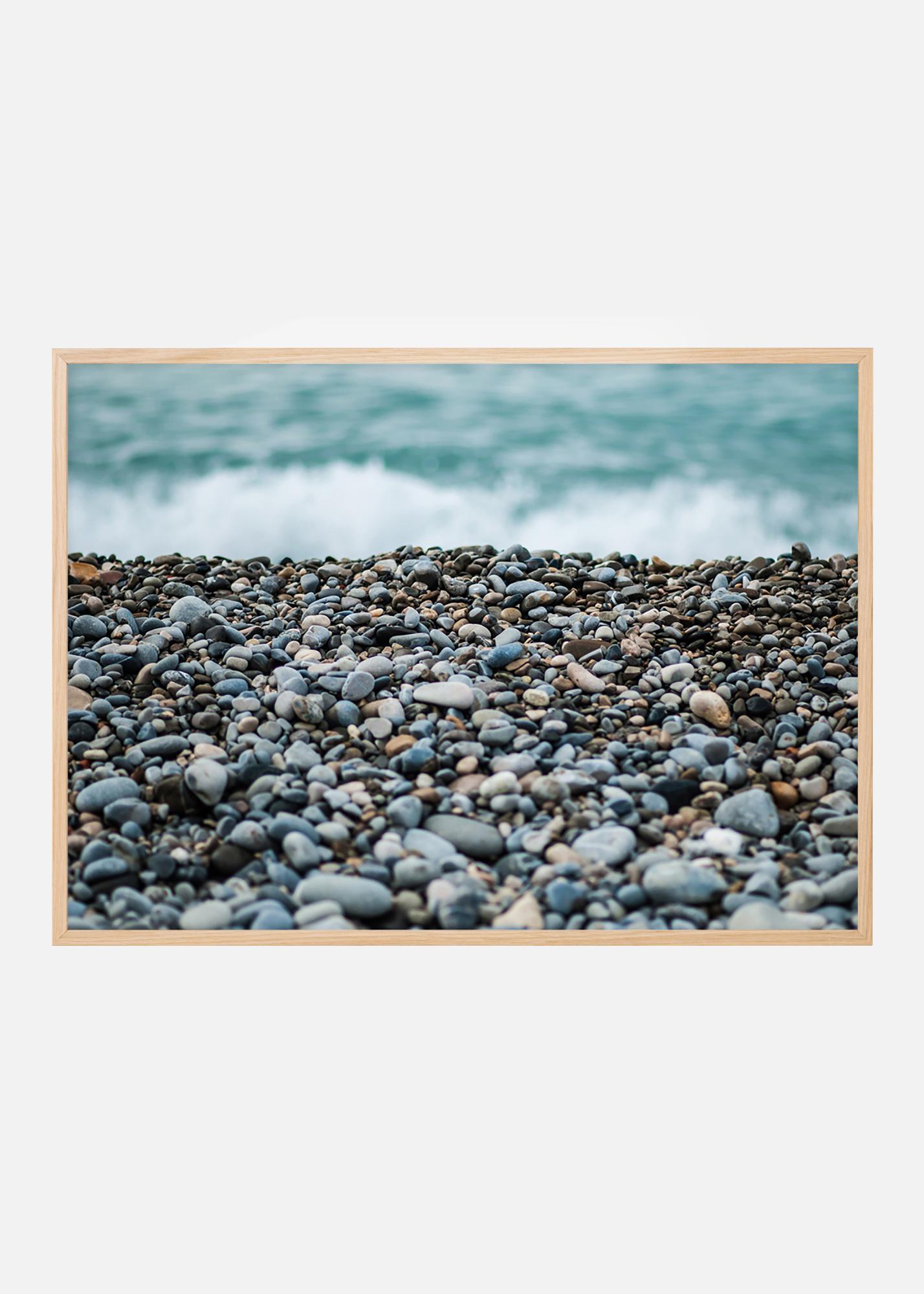 Ascolta il rumore delle onde del mare da questo poster con una bellissima spiaggia di ciottoli in primo piano. La breve profondità di campo crea un'immagine interessante che cattura lo sguardo. Riesci a trovare un pezzo di vetro levigato tra le rocce? La scala di grigi e blu si abbina bene con una cornice sottile su una parete chiara, possibilmente con accessori marini.