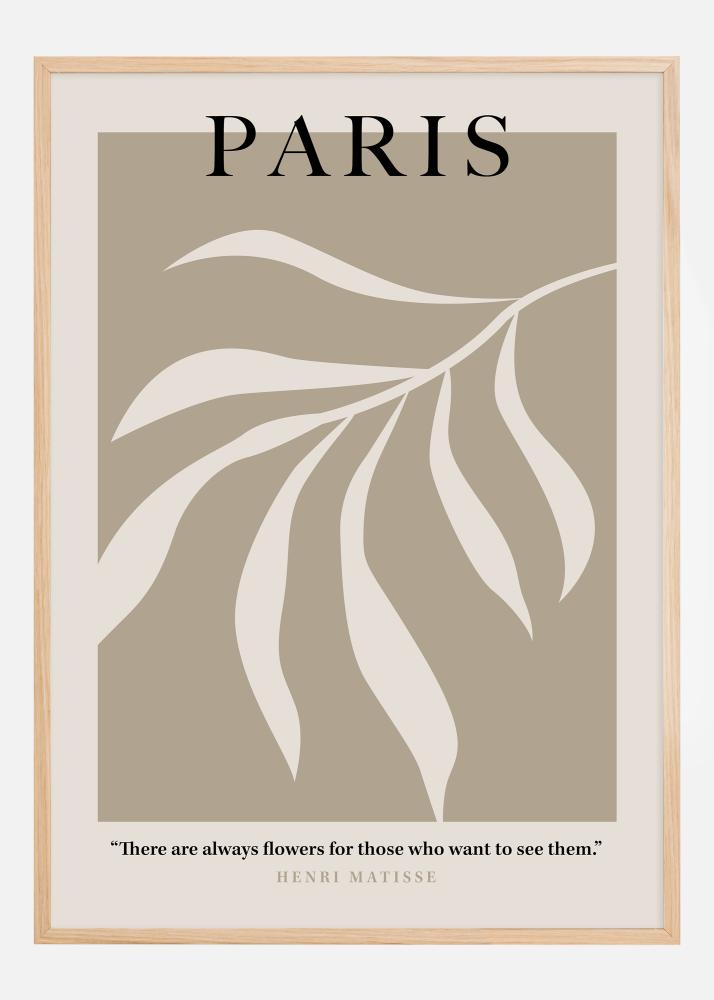 Questo elegante e raffinato poster celebra Parigi, la città che ha ispirato tanti artisti e poeti. Il suo design semplice ma potente consiste in linee bianche che formano una flora astratta, su uno sfondo beige uniforme. Il testo "PARIGI" è elegantemente posizionato in alto, dando un'associazione diretta alla classe e alla senza tempo della città. In basso si trova una citazione di Henri Matisse, "Ci sono sempre fiori per coloro che vogliono vederli.", che aggiunge uno strato di profondità e riflessione a questo poster già significativo.