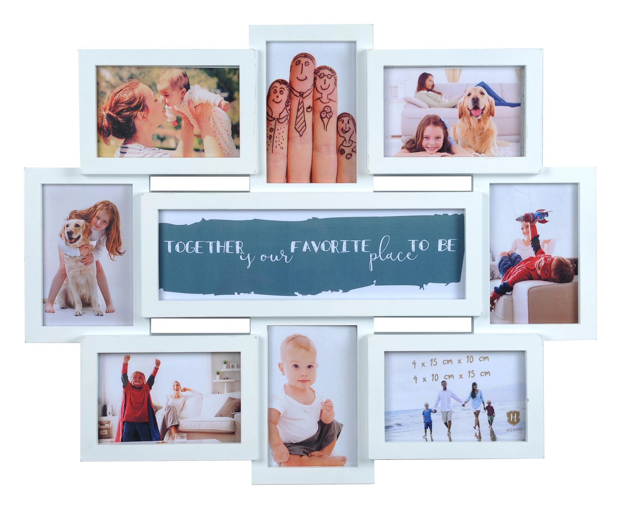 Raccogli le tue foto più belle in una Cornice multipla elegante! Questa cornice non è solo piacevole da vedere, ma è anche personalizzabile! Infatti, sono inclusi 5 adorabili testi con temi diversi che puoi inserire nella cornice centrale (9ª) e cambiare quando vuoi. Ad esempio, puoi inserire testi come "All you need is love" o "Say yes to family". La Cornice multipla è disponibile nei colori nero e bianco.