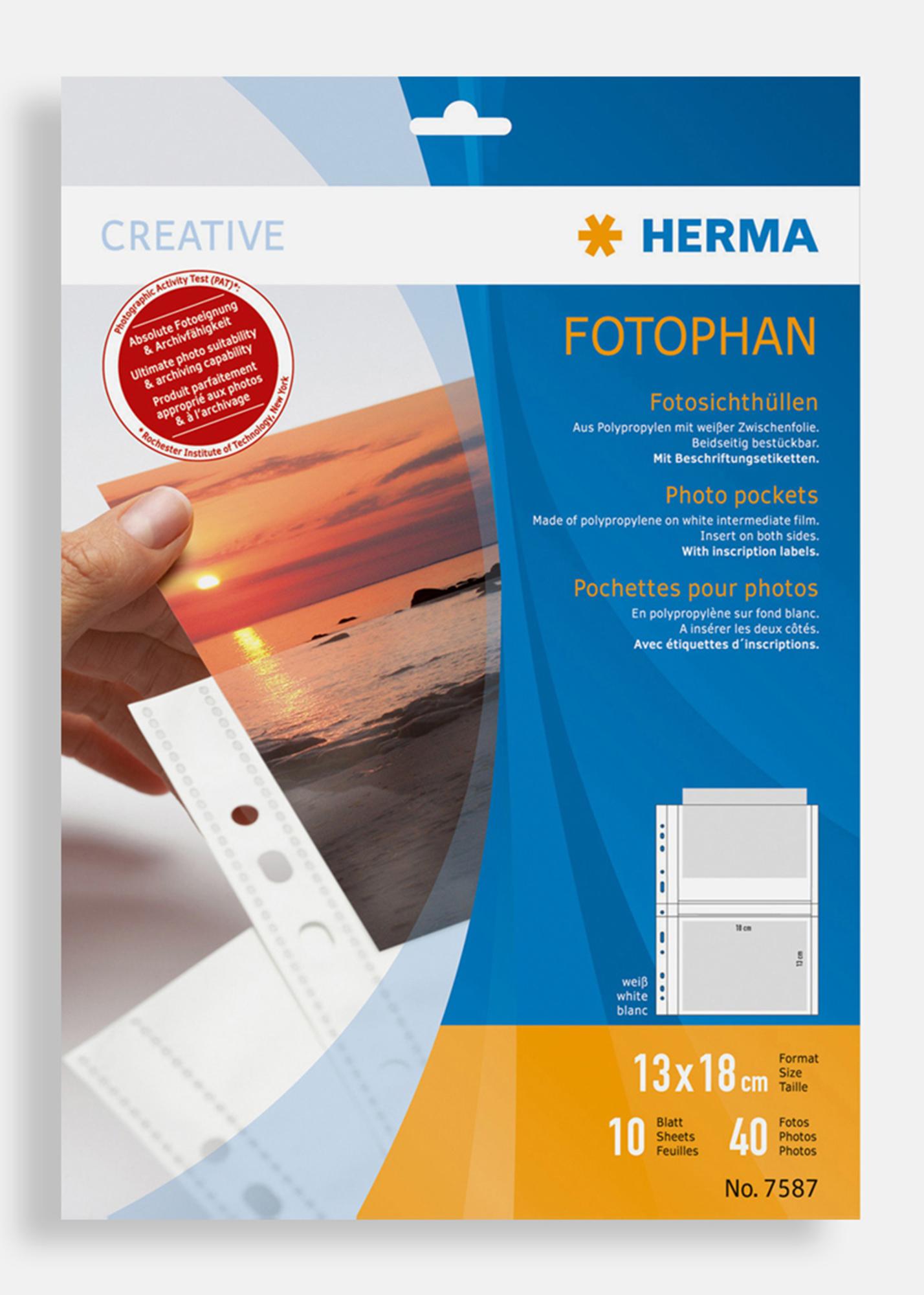Tasche fotografiche bianche a doppia faccia per foto nel formato 13x18 cm (formato orizzontale). Tutte le tasche fotografiche di Herma sono sempre prive di acidi e garantite innocue per le tue foto. Le tasche fotografiche sono adatte per essere montate in raccoglitori ad anelli di formato standard. Le tasche fotografiche sono prive di PVC.