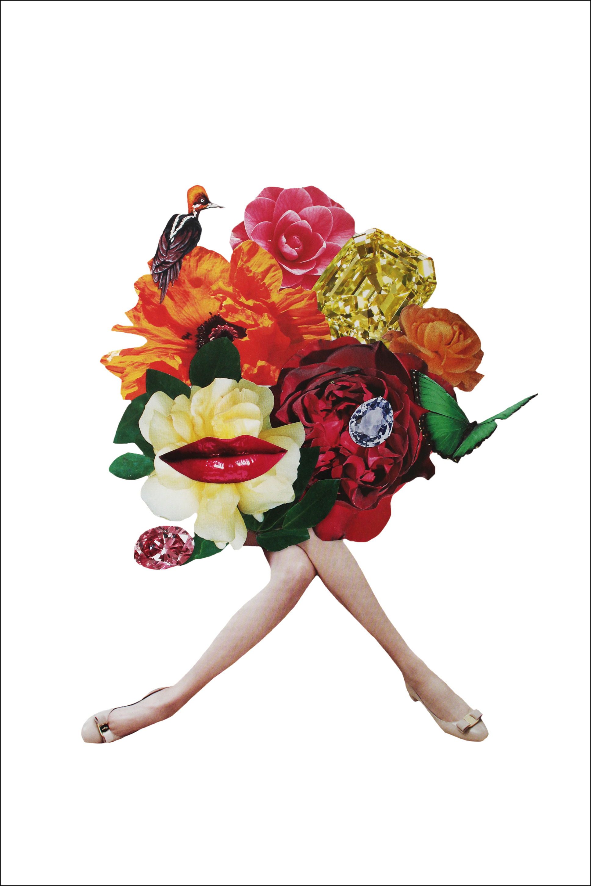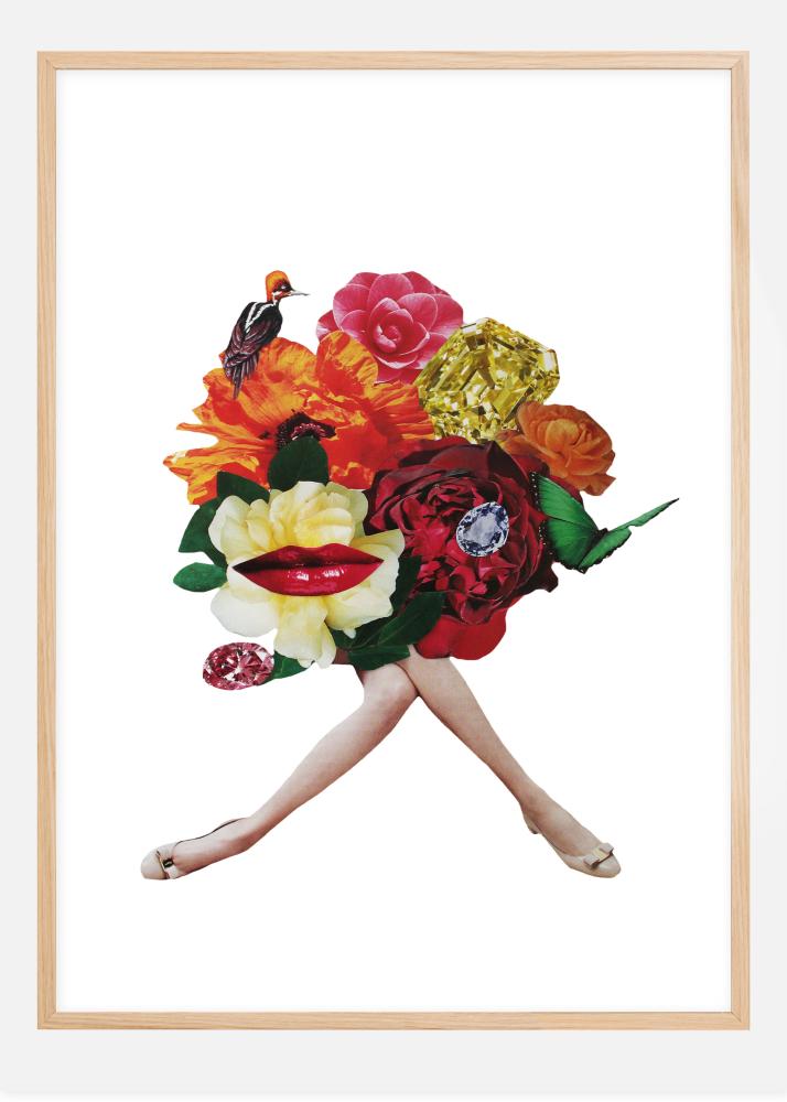 Un poster colorato con una donna che si nasconde dietro una bellissima composizione di fiori colorati. Tra i fiori c'è una deliziosa farfalla verde, tre gioielli preziosi, labbra perfettamente proporzionate e un magnifico picchio. Questa stampa colorata e divertente su uno sfondo bianco illuminerà qualsiasi parete vuota.