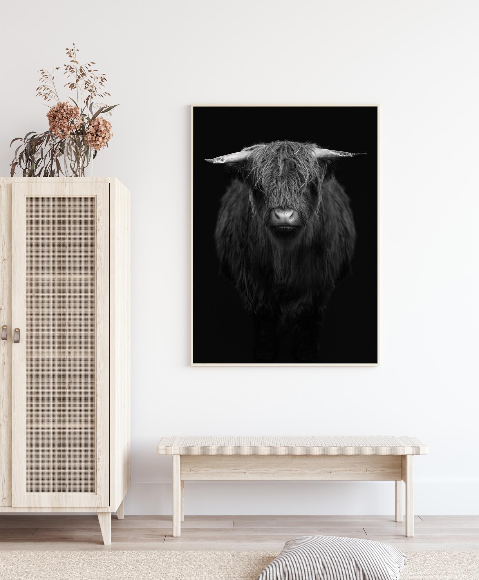 Un'incredibile montagna nera contro uno sfondo nero. Questa bellissima creatura guarda dritto nella telecamera e mostra il suo lungo pelo nero e ondulato. Anche se questo poster è un'immagine nera su nera, le corna bianche e il naso della mucca emergono chiaramente. Ammira la bellezza di questa creatura mentre guarda nella telecamera.