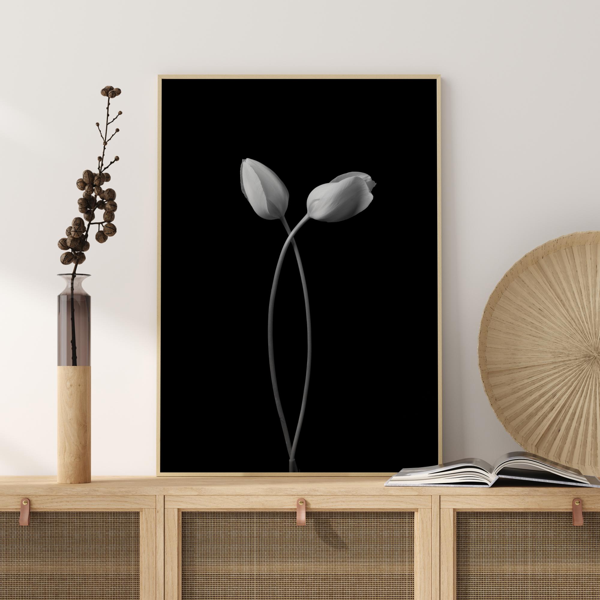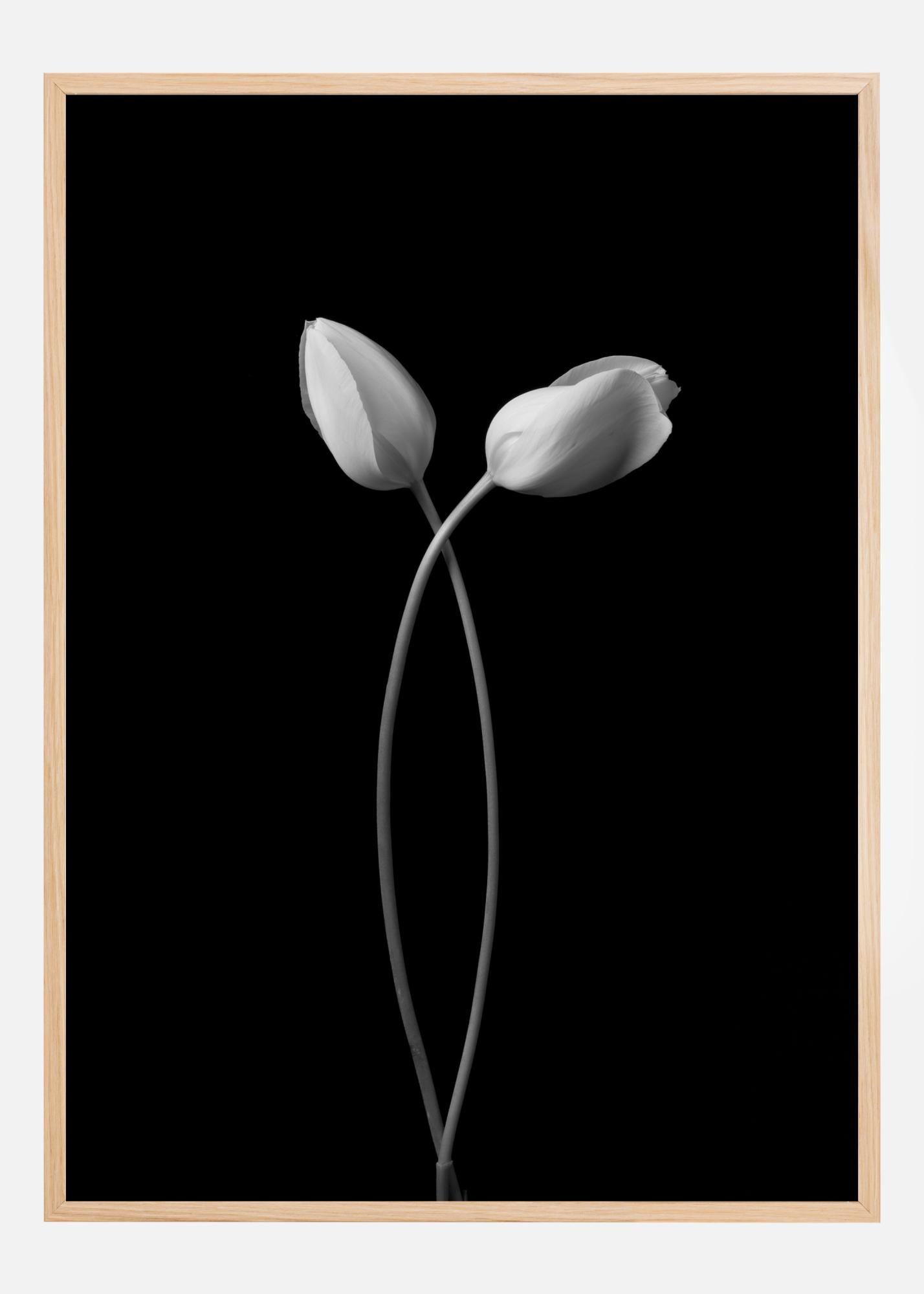 Un elegante poster con due tulipani che si abbracciano su uno sfondo nero comune. Posizionalo su una parete gialla per dare colore a questa scena drammatica. Senti il legame con la natura con questo poster.
