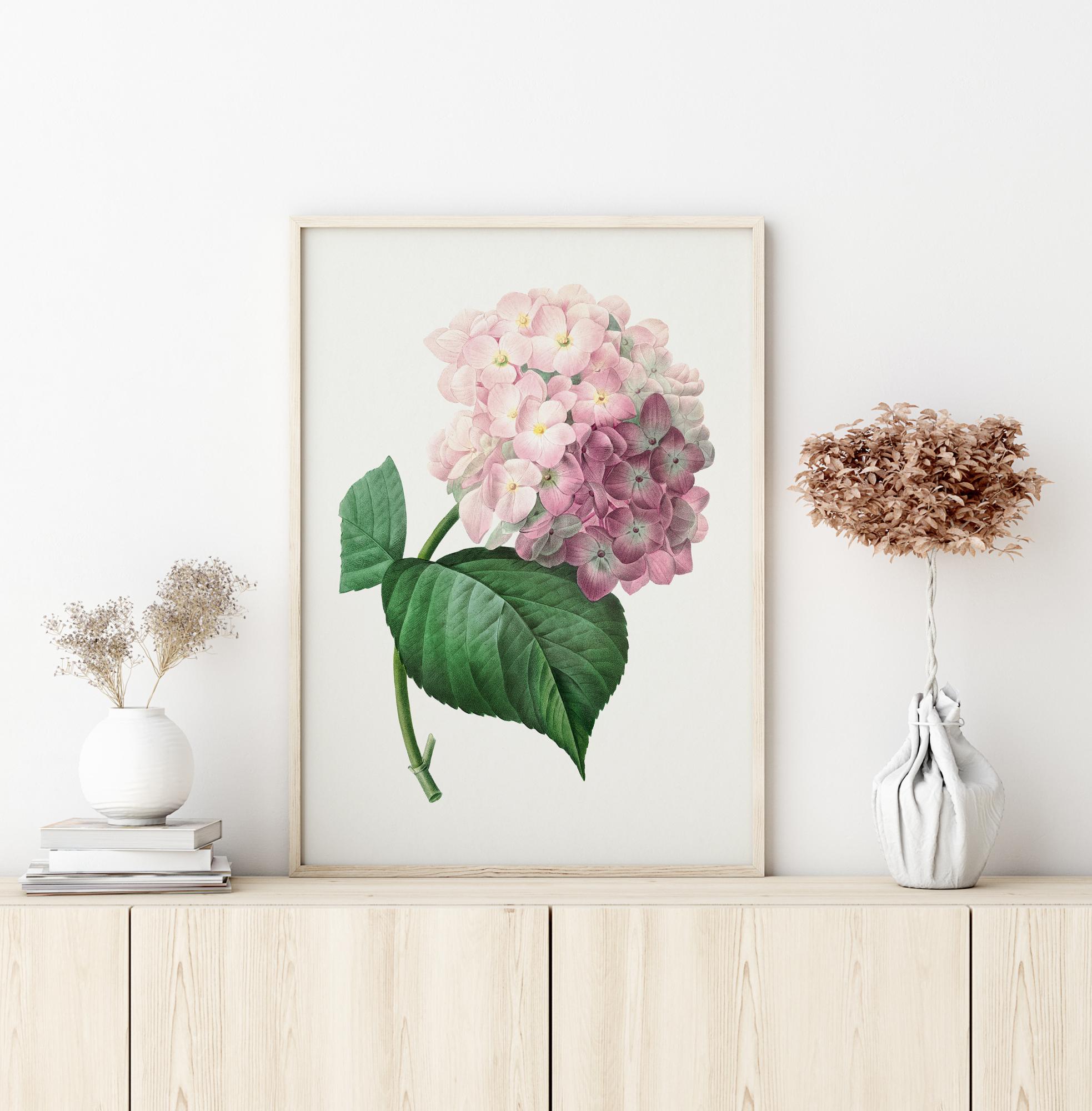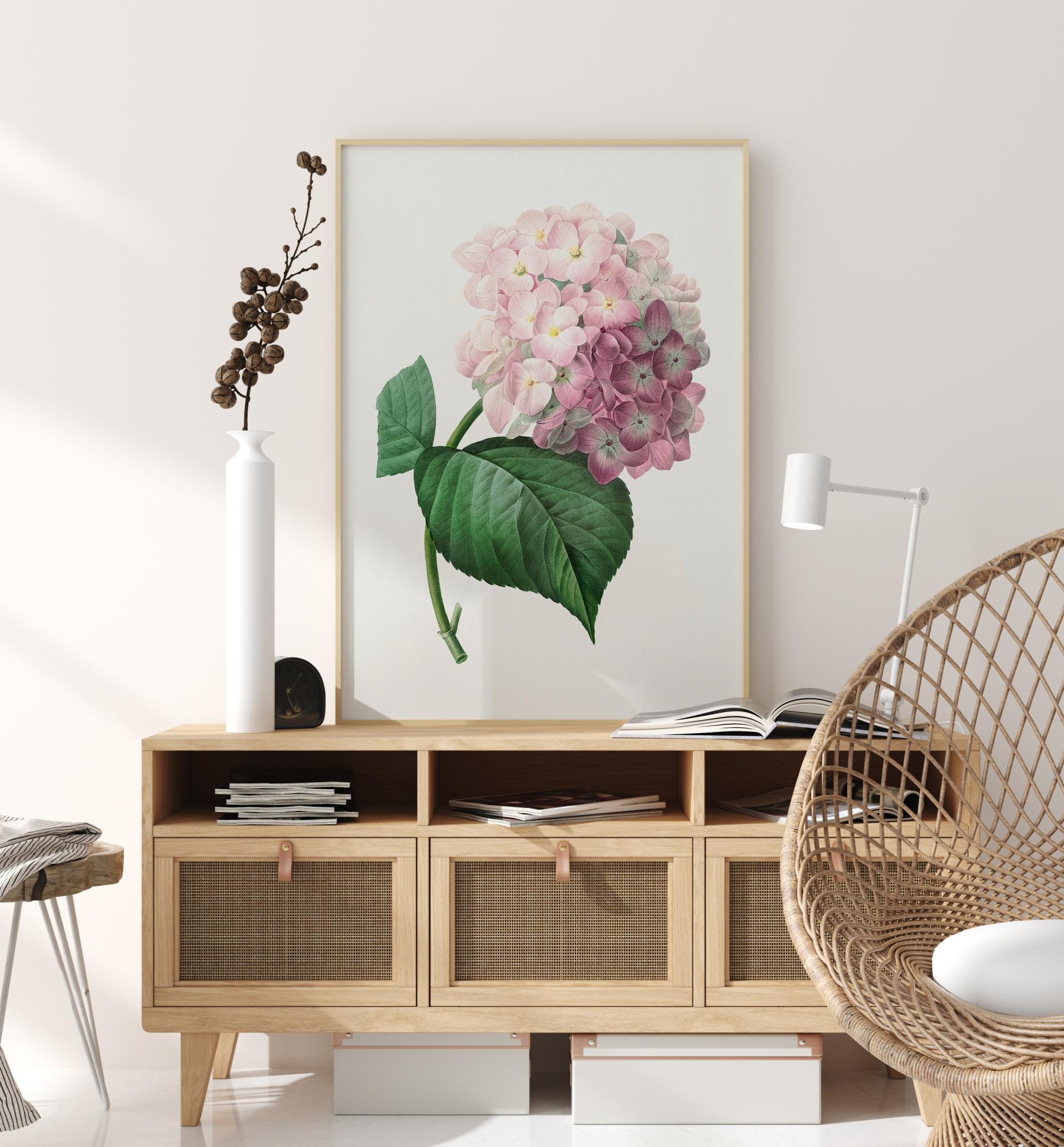 Un poster floreale con un'ortensia. Petali rosa morbidi con un gambo verde morbido e una foglia verde dominano al centro dell'immagine. Su uno sfondo bianco puro, questo fiore bello e delicato dona una sensazione di calma e tranquillità. Appendi questa immagine in un giardino d'inverno per dare alla stanza un tocco di classe in più.