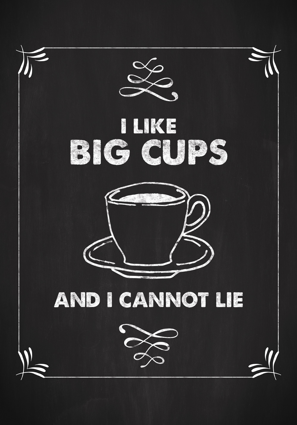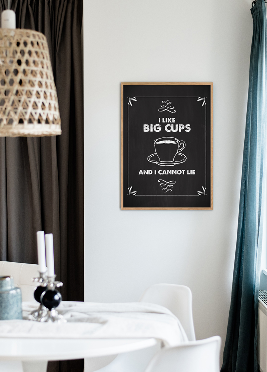 Stampa creativa print con il messaggio - I like big cups, and I cannot lie, per chi ama le tazze grandi di caffè o tè. Il poster in bianco e nero, con l'aspetto di una lavagna, si adatta bene a una mensola in cucina insieme a libri di cucina e accessori per la preparazione dei cibi. Oppure perché non appenderlo insieme ad altre stampe grafiche su una parete con un tema legato al mondo della cucina. Completate il poster con una semplice cornice nera che lascia parlare il testo e che rafforza l'impressione di una lavagna scolastica.