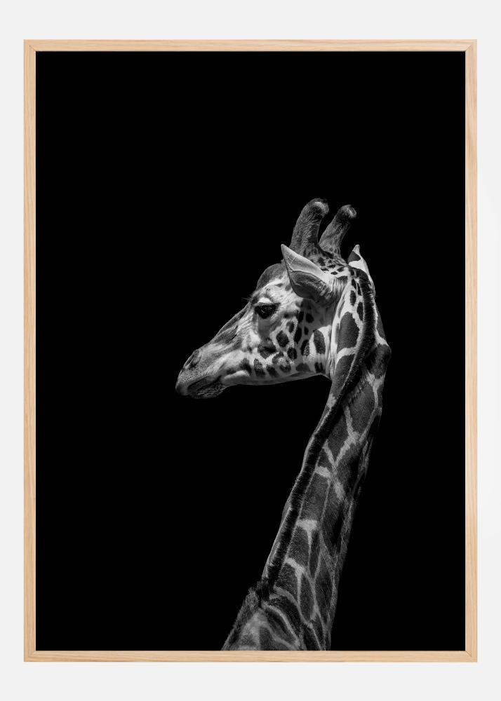 Questo poster audace ed espressivo presenta una maestosa giraffa su uno sfondo nero carbone, creando un contrasto drammatico che cattura lo sguardo dell'osservatore. Il pattern unico della giraffa in scala di grigi è abilmente catturato, con ogni macchia e linea enfatizzata nei dettagli. La ricchezza di dettagli nella texture della pelle della giraffa e le morbide sfumature di grigio sullo sfondo nero creano un effetto quasi tridimensionale.