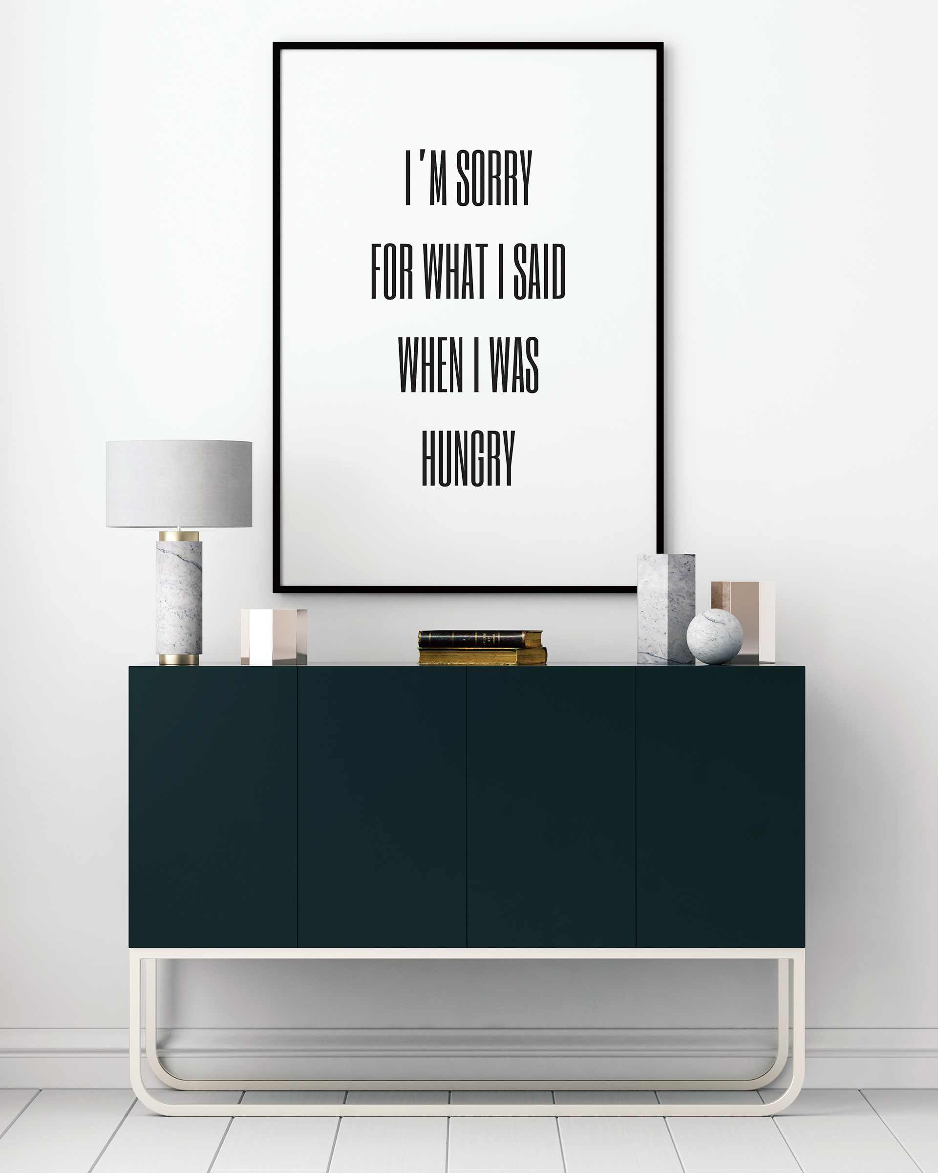 Un poster di testo semplice ed elegante con la scritta "Mi dispiace per quello che ho detto quando avevo fame" in lettere maiuscole. Un poster con un messaggio divertente, perfetto da avere in cucina come una piccola scusa preventiva se il pasto viene servito un po' tardi.