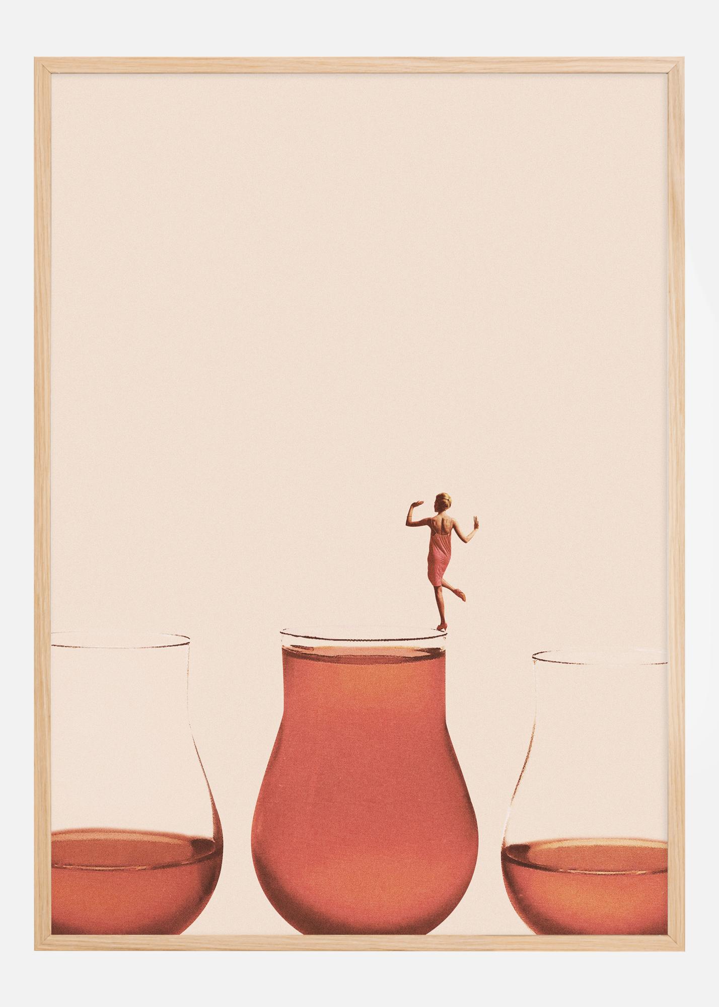 Questo poster coltivato e esteticamente attraente raffigura una figura femminile che esegue un delicato atto di equilibrio sopra il bordo di un bicchiere di vino traboccante. La donna, vestita con un abito, sembra ballare o muoversi con una nobile grazia, un'immagine di controllo e precisione in un'azione che può sembrare rischiosa. La sua silhouette appare quasi come una metafora per l'approccio raffinato richiesto per godere delle cose più raffinate della vita, con un apprezzamento equilibrato per il pieno e il vuoto.