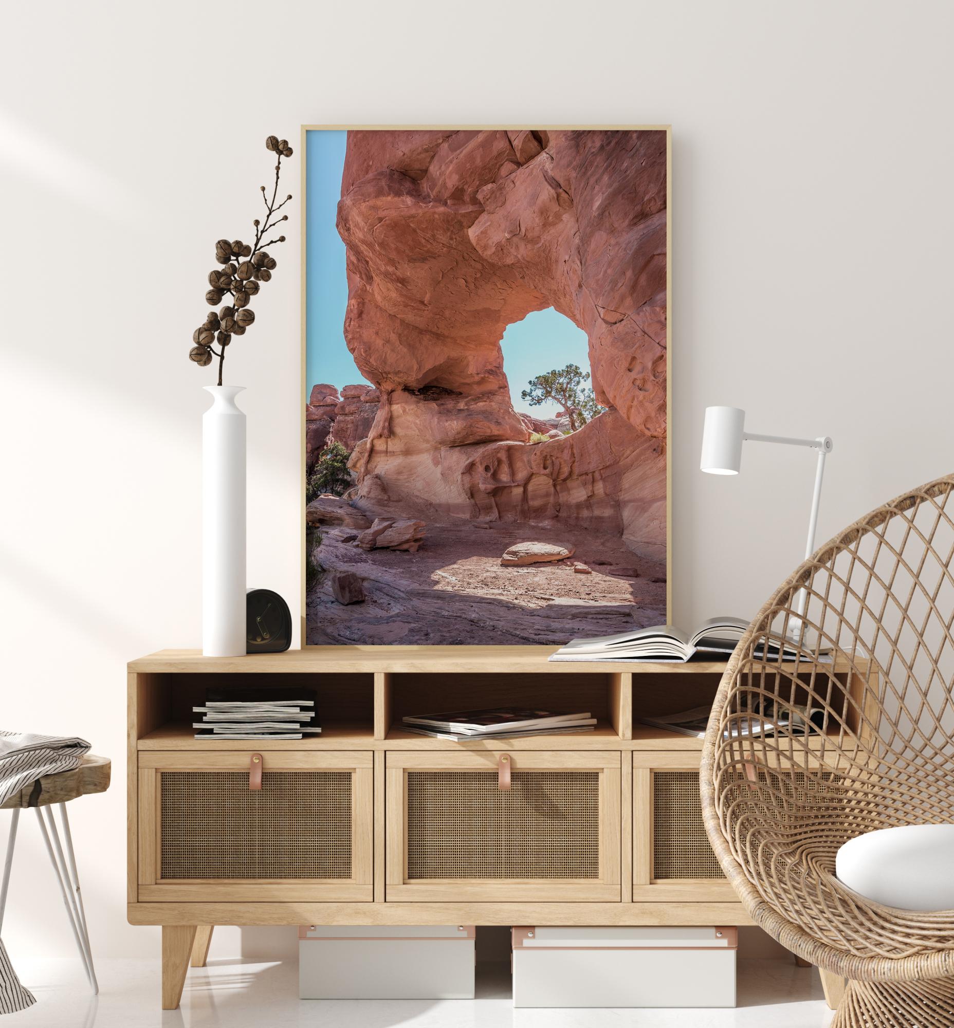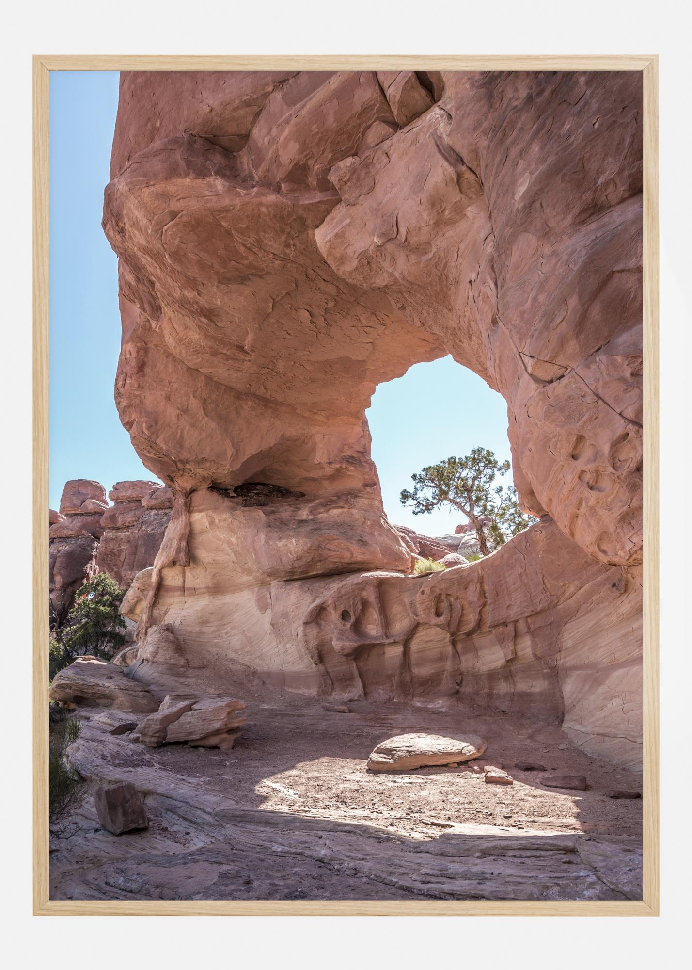Un incredibile poster naturale di una roccia arancione con un buco al centro. Un piccolo albero spunta dall'altro lato del buco. Il sole brilla attraverso il buco nella roccia e crea un'area ombreggiata davanti alla roccia. I bellissimi colori vivaci sono perfetti per illuminare una stanza noiosa.