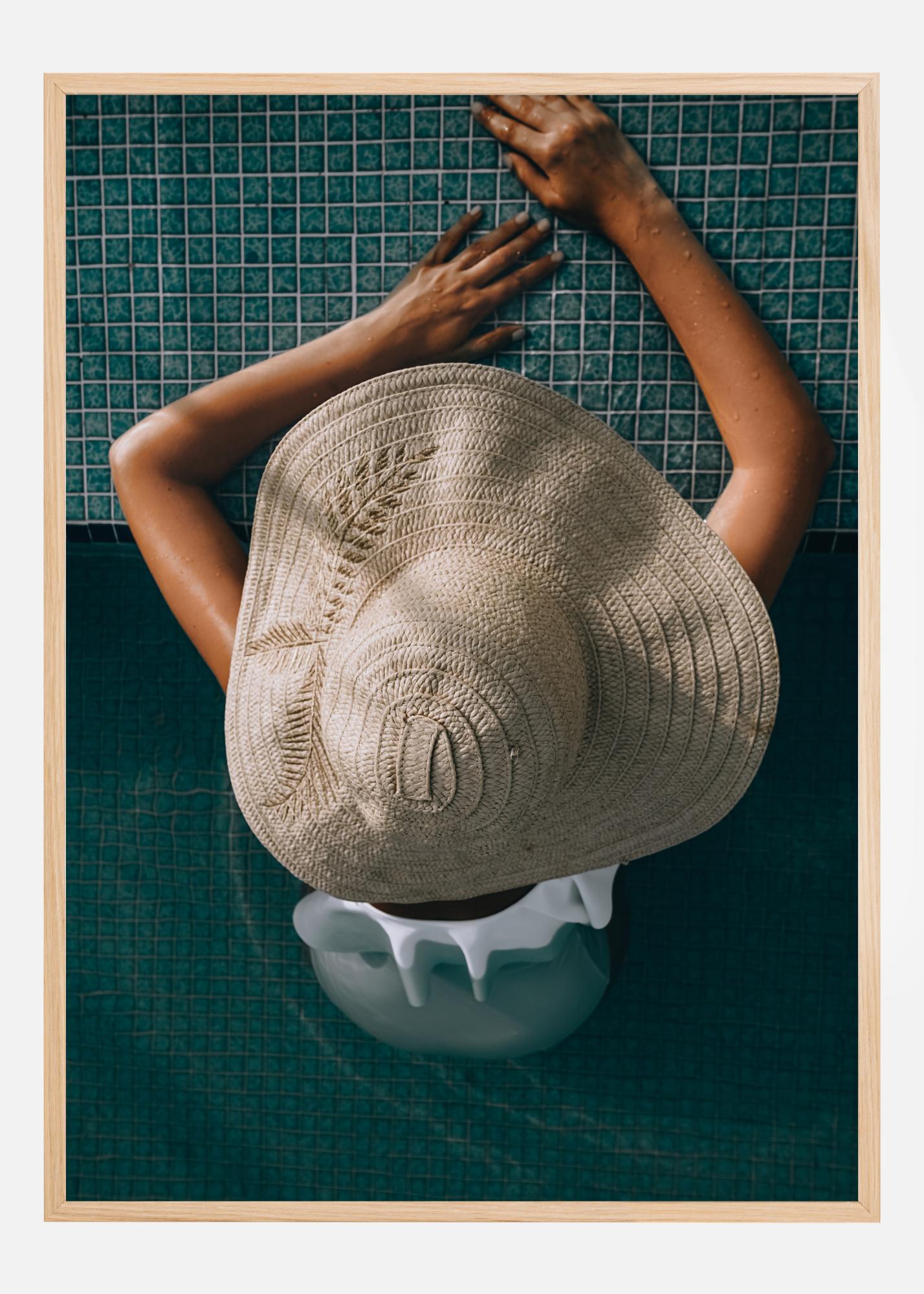 Questo poster rilassante ed elegante cattura un momento tranquillo a bordo piscina, dove una persona indossa un cappello a tesa larga riposando sul bordo dell'acqua. La vista unica dall'alto e lo sfondo a mosaico blu calmante conferiscono una sensazione di lusso leggero e sofisticazione. Questa stampa è un meraviglioso dettaglio d'arredo per creare un'oasi di calma e relax nella tua casa.