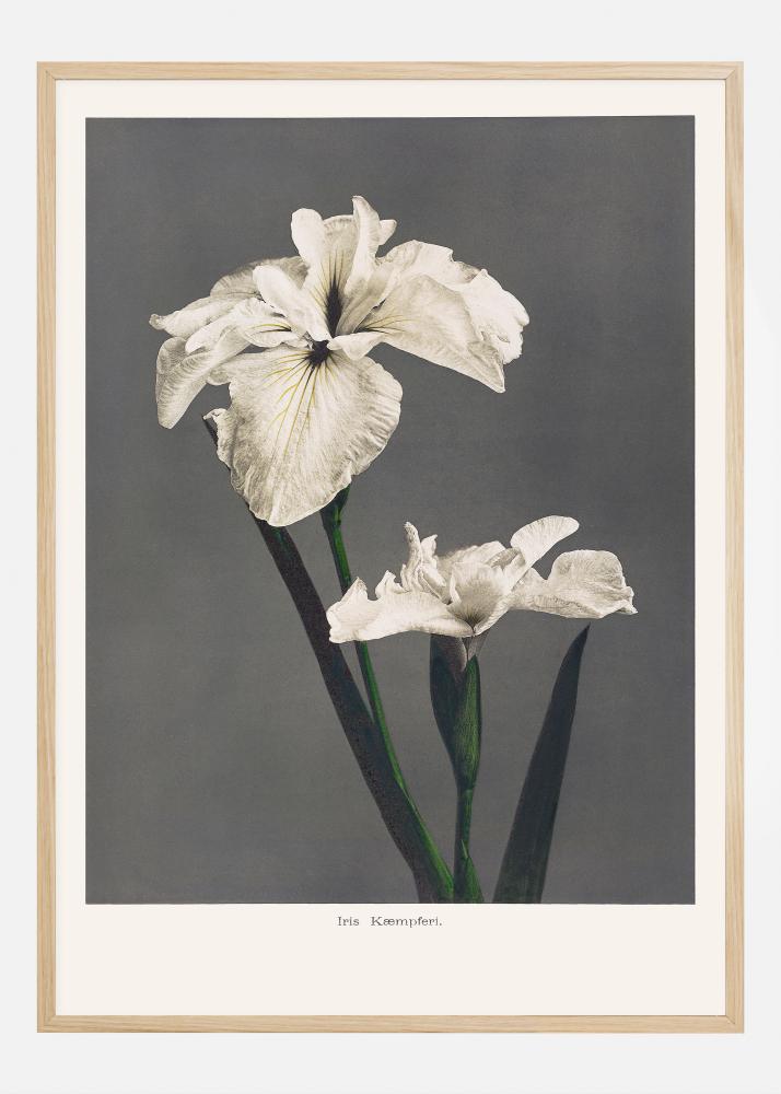 Questo poster elegante presenta l'Iris Kaempferi, conosciuta anche come iris giapponese, in sfumature di oro pallido e bianco su uno sfondo grigio sottile che esalta le qualità scultoree di questi affascinanti fiori. I dettagli nella struttura dei fiori sono finemente evidenziati con ombre e luci che giocano sui petali, mentre le strisce scure, quasi nere, nel cuore del fiore aggiungono profondità e dimensione. Una composizione armoniosa di colore e forma che ricrea la bellezza naturale di questi fiori.