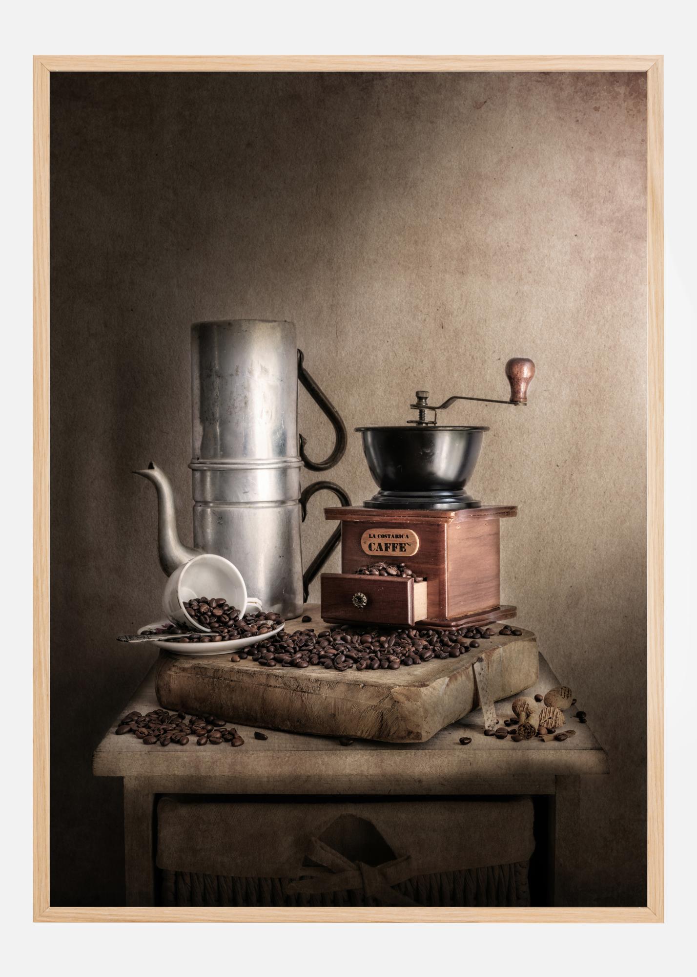 Una stampa a tema caffè con un macinacaffè, una caffettiera, chicchi di caffè e una tazza bianca e un piattino. Le tonalità marroni morbide di questa stampa creano un'immagine rilassante in cui si può quasi sentire l'odore dei meravigliosi chicchi di caffè tostati. L'immagine perfetta da appendere nella tua cucina.
