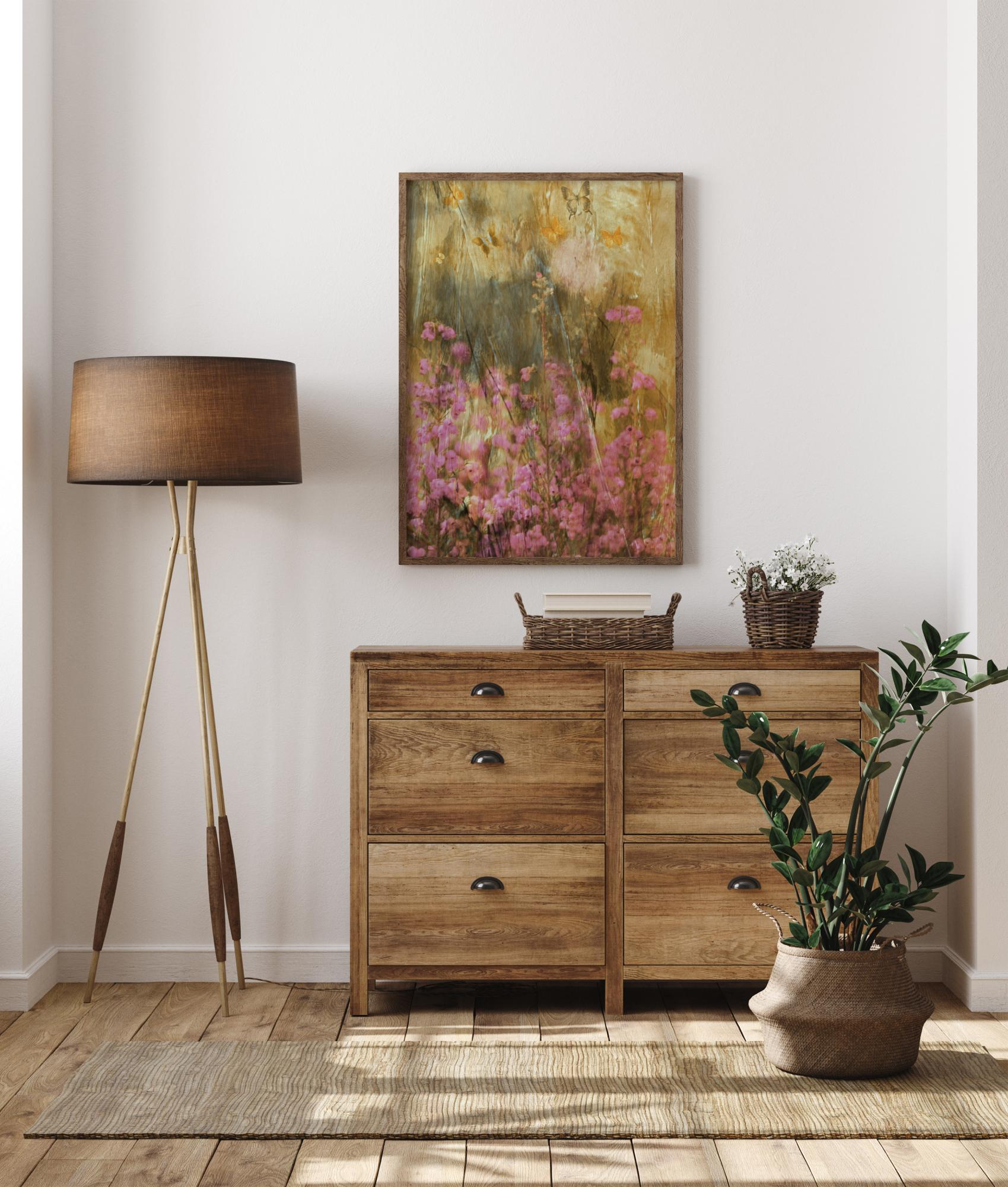 Un bellissimo poster naturalistico che raffigura la primavera con erba secca rosa e marrone su un campo. I colori pastello morbidi donano una sensazione rilassante e pacifica. I delicati fiori rosa pastello riempiono l'immagine con le bellissime farfalle marroni che volano sullo sfondo. Questa è un'immagine incantevole per ogni stanza della casa se si apprezza la natura.