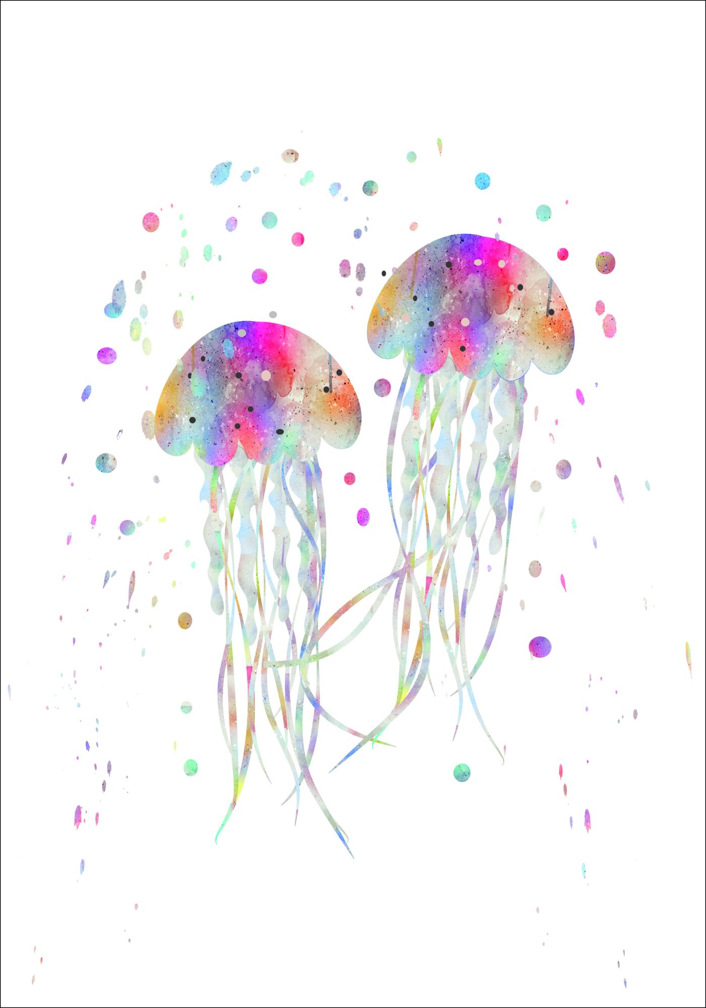Una stampa divertente e creativa di due piccole meduse multicolori. Con i loro orologi e tentacoli colorati, sono circondati da punti casuali colorati su uno sfondo bianco. Un poster incantevole che illuminerà qualsiasi stanza.