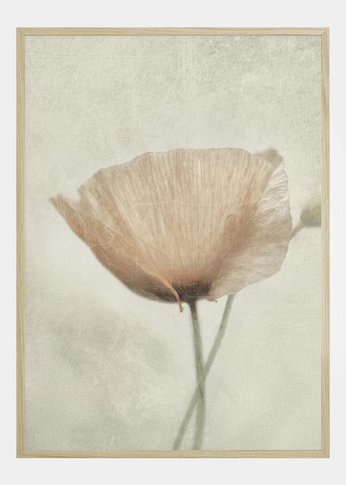 Un bellissimo poster naturalistico con un unico papavero color pesca su uno sfondo beige. Con i suoi petali delicatamente colorati e aperti, trasmette una sensazione di calma e tranquillità. La trasparenza dei petali mostra l'interno nero del fiore. Un'immagine espressiva adatta per essere appesa su una parete di colore pallido.
