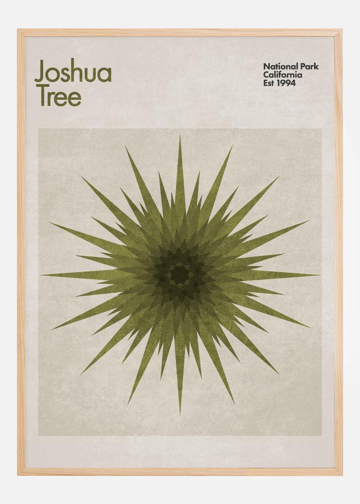 Questo poster evocativo raffigura un'interpretazione astratta dell'iconico Albero di Joshua, centrato e prominente al centro dell'immagine. Il colore verde intenso nel motivo richiama la natura calmante e il paesaggio desertico robusto di cui l'albero è parte. L'astrazione dell'albero, con le sue punte allungate, crea un motivo quasi ipnotizzante che è sia contemporaneo che senza tempo.