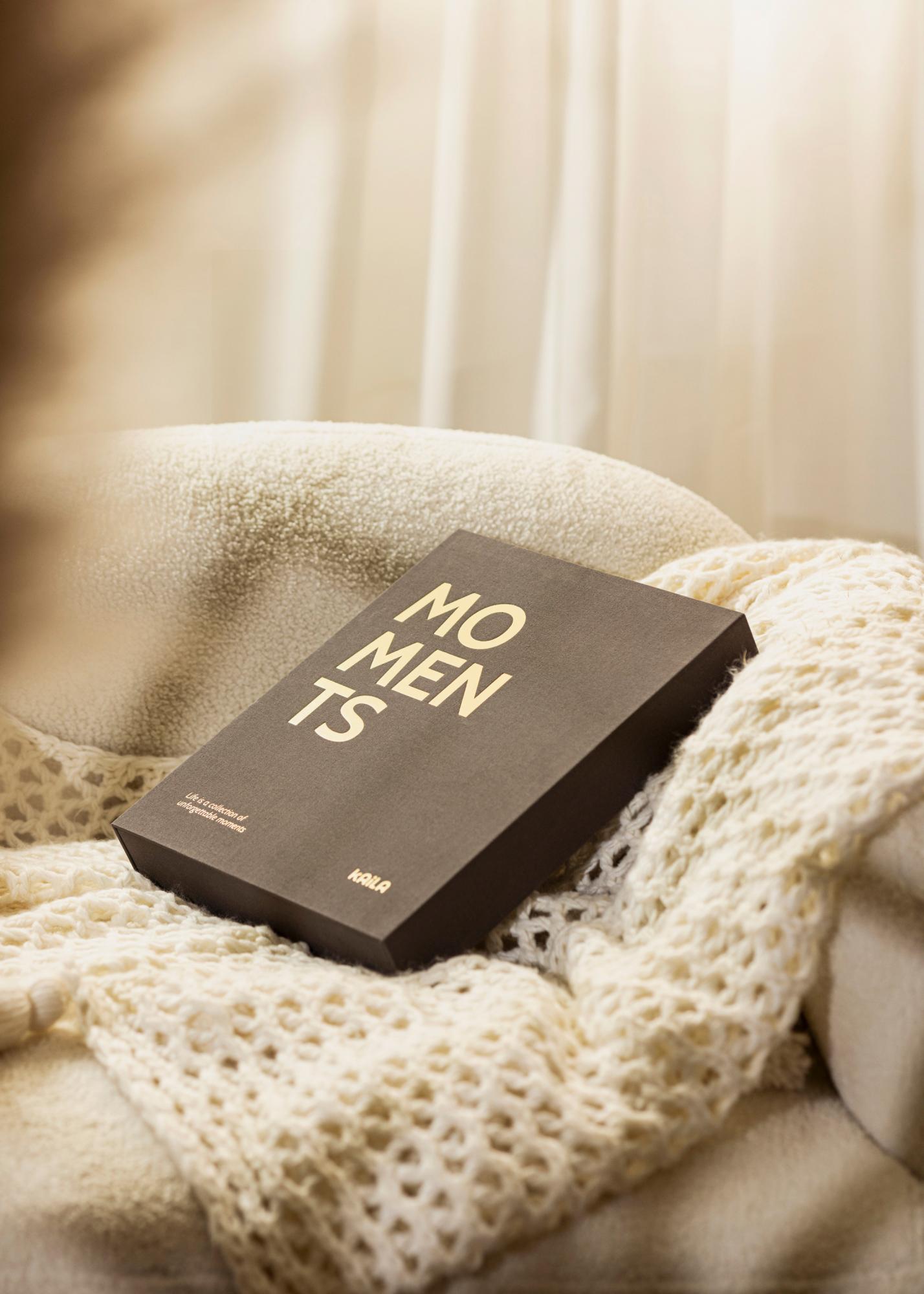 L'album fotografico è progettato come una scatola che puoi aprire per accedere alle tue foto. La copertina è decorata con tessuto nero, che conferisce una sensazione di lusso. Sulla parte anteriore e sul lato corto è presente il testo "MOMENTS". Nell'angolo in alto a sinistra del lato superiore è visibile il bellissimo sottotitolo "La vita è una collezione di momenti indimenticabili".