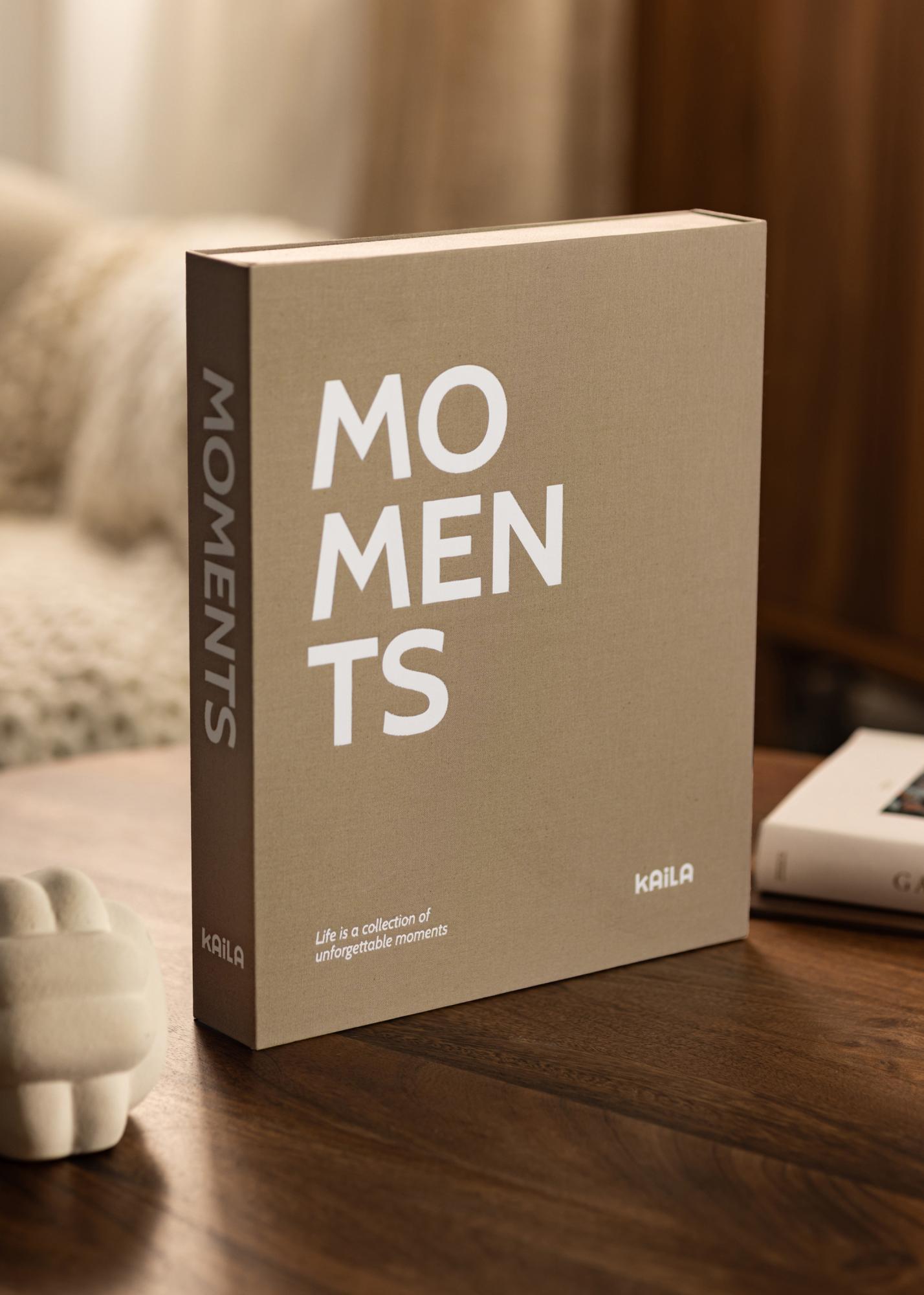 L'album fotografico è progettato come una scatola che puoi aprire per accedere alle tue immagini. La copertina è decorata con tessuto grigio, che conferisce una sensazione di lusso. Sulla parte anteriore e sul lato corto è presente il testo "MOMENTS". Nell'angolo in alto a sinistra del lato superiore è visibile il bellissimo sottotitolo "La vita è una collezione di momenti indimenticabili".