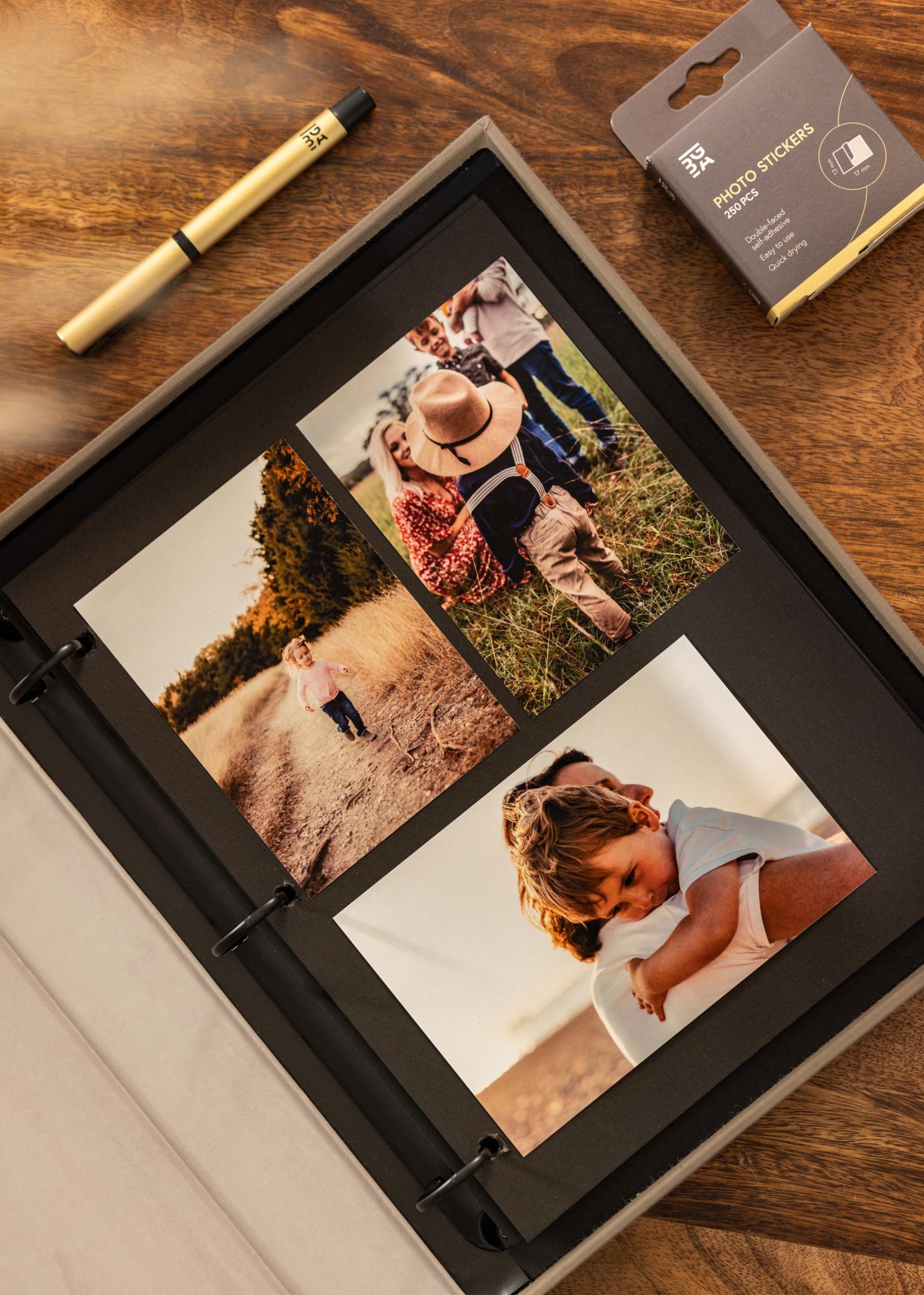 Questo è l'album fotografico per coloro che desiderano conservare i loro migliori ricordi fotografici con stile! L'album è progettato come un elegante Coffee Table Book, che può essere posizionato come decorazione su credenze e tavoli nella tua casa. All'interno dell'album troverai un raccoglitore ad anelli con 60 pagine nere (30 fogli) che puoi riempire con le tue migliori fotografie. Incollerai le foto nell'album da solo, il che ti permette di essere creativo e combinare immagini di diversi formati e dimensioni.